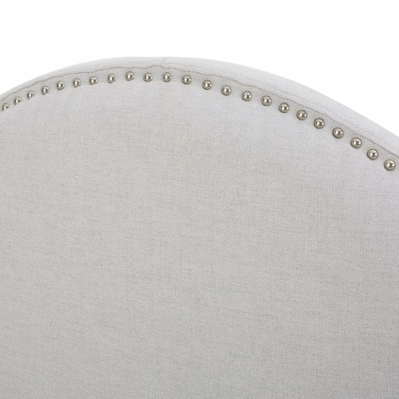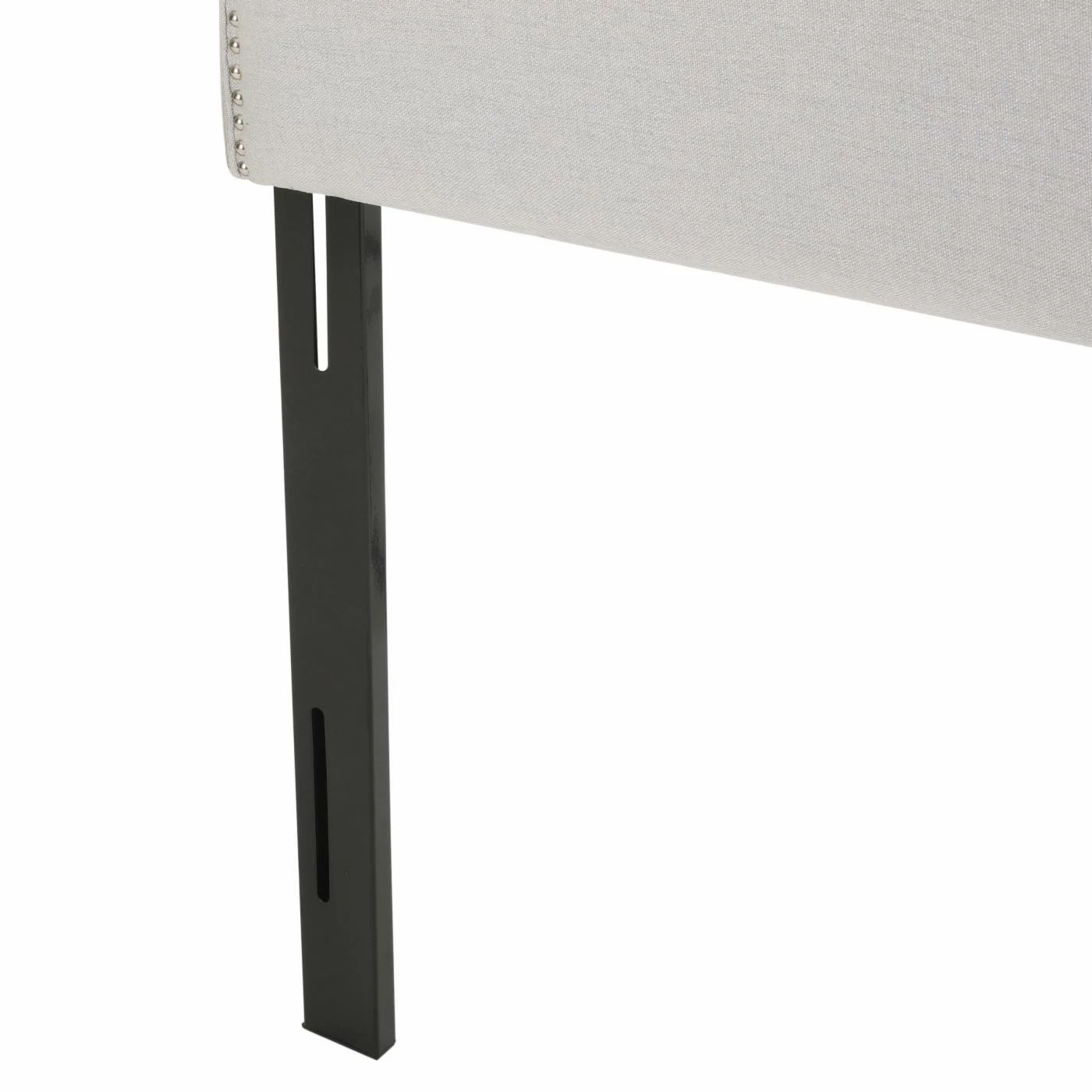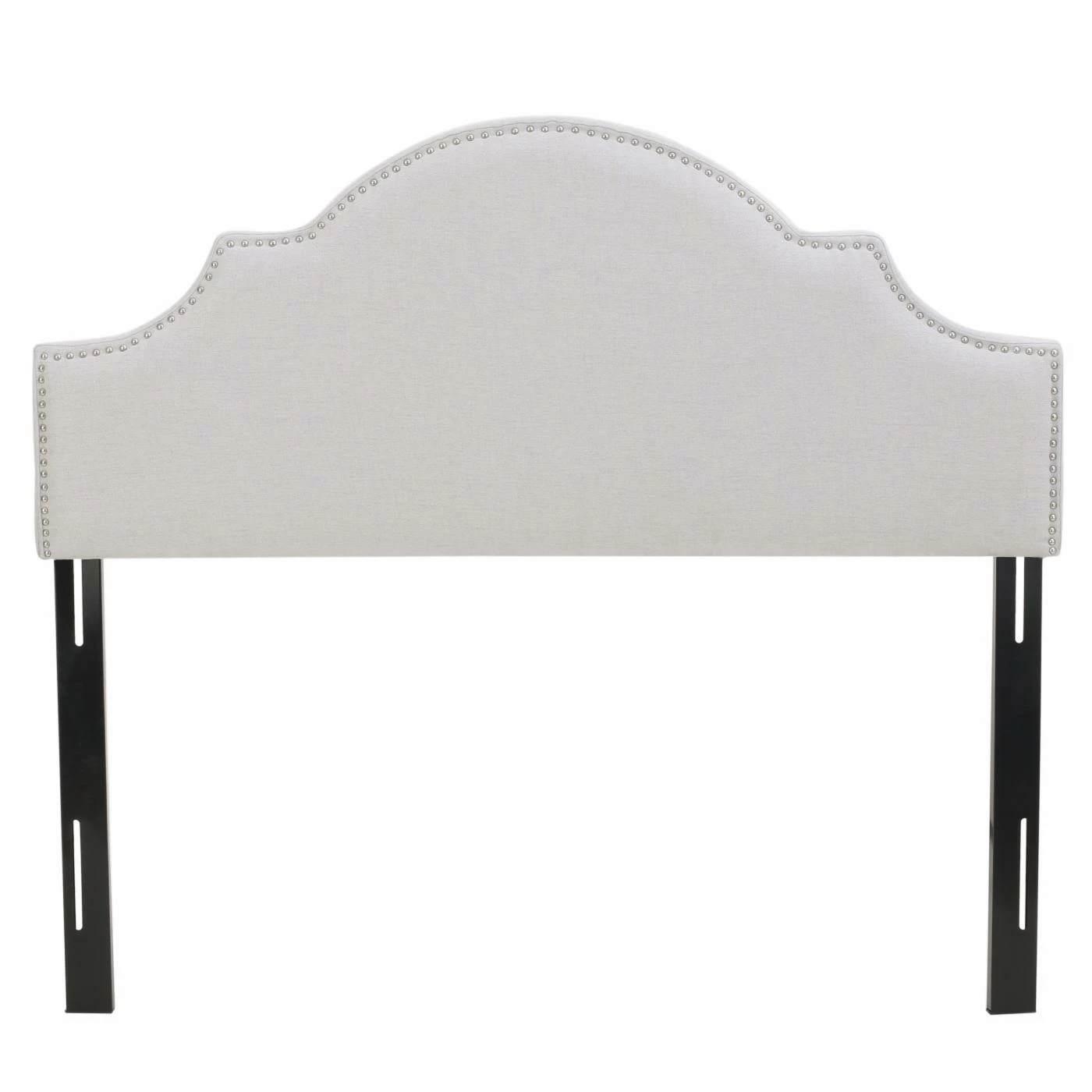 Showcasing graceful curves accentuated by gleaming nail heads, the Nora Upholstered Headboard with Nailhead Trim is an elegant focal point for a transitional or contemporary bedroom. The headboard is padded for comfort and wrapped with crisp fabric upholstery in your choice of available colors. Adjustable iron legs make the headboard compatible with full and queen bed frames and mattresses of a range of thicknesses.