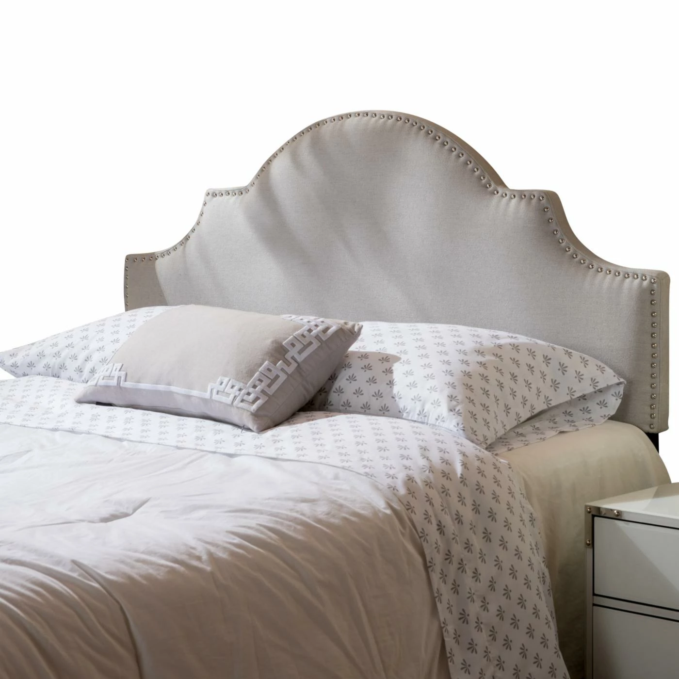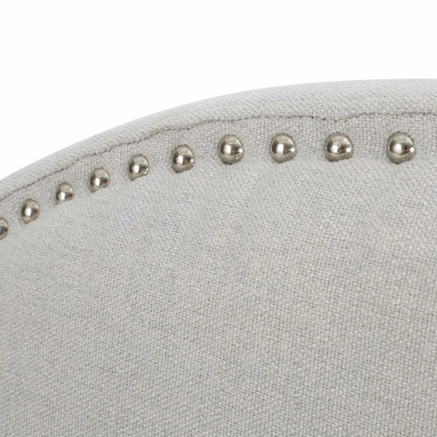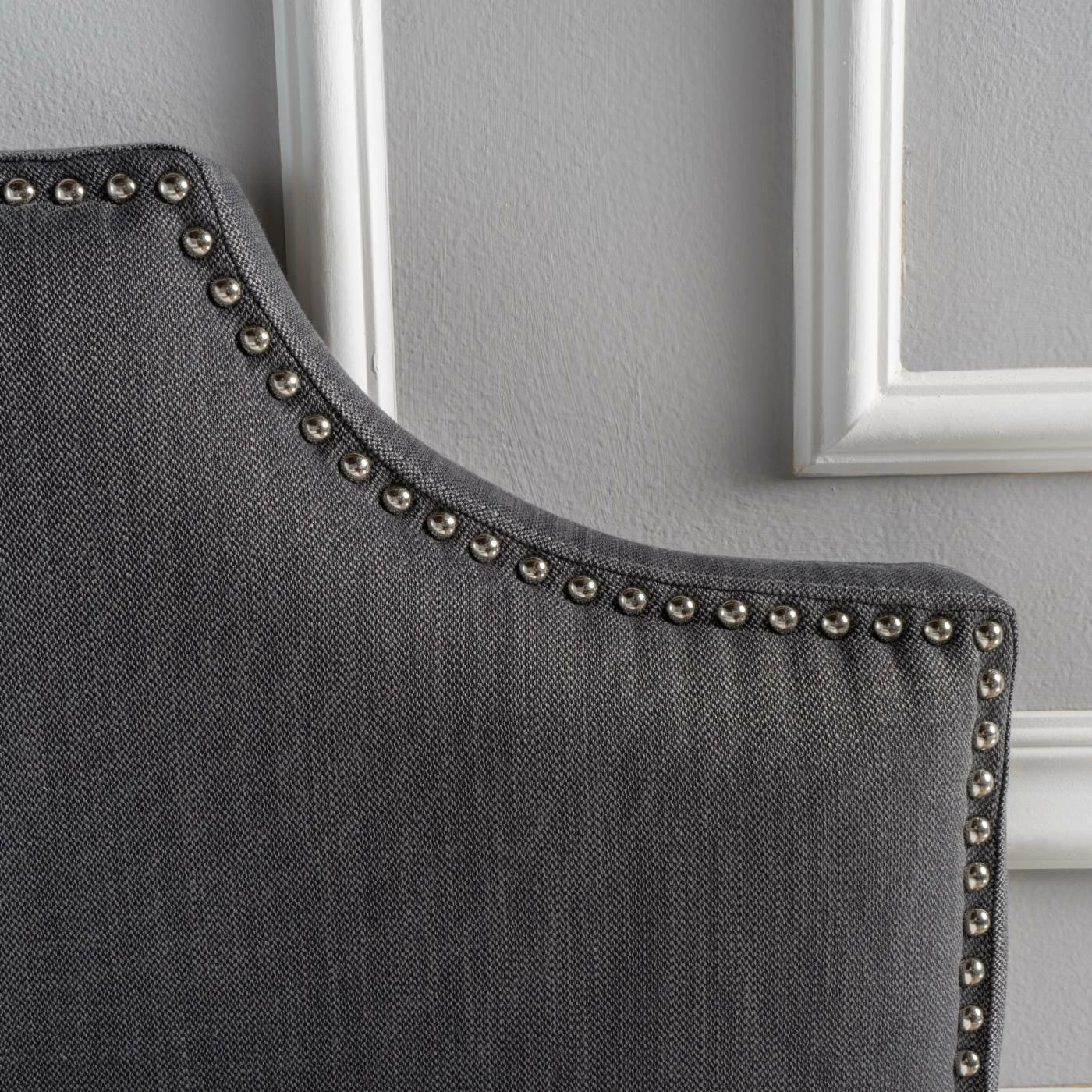 Showcasing graceful curves accentuated by gleaming nail heads, the Nora Upholstered Headboard with Nailhead Trim is an elegant focal point for a transitional or contemporary bedroom. The headboard is padded for comfort and wrapped with crisp fabric upholstery in your choice of available colors. Adjustable iron legs make the headboard compatible with full and queen bed frames and mattresses of a range of thicknesses.