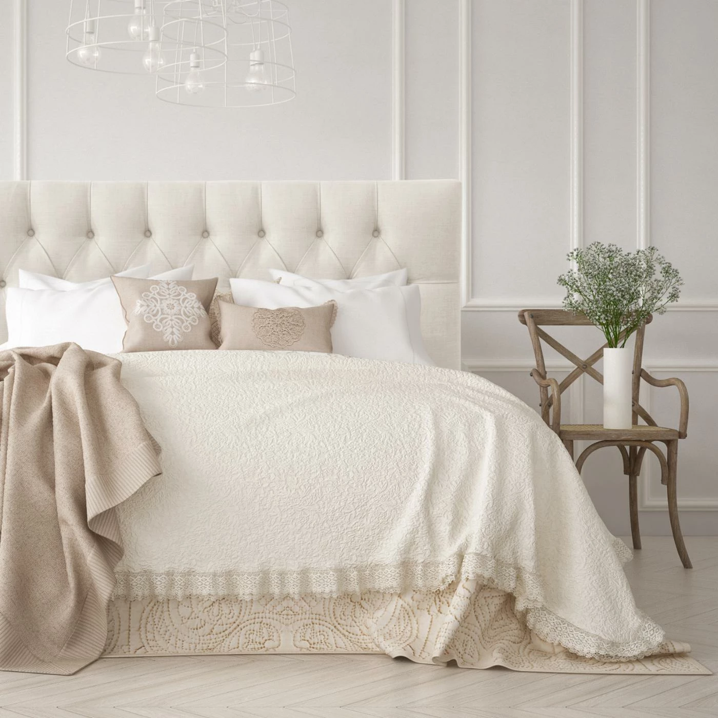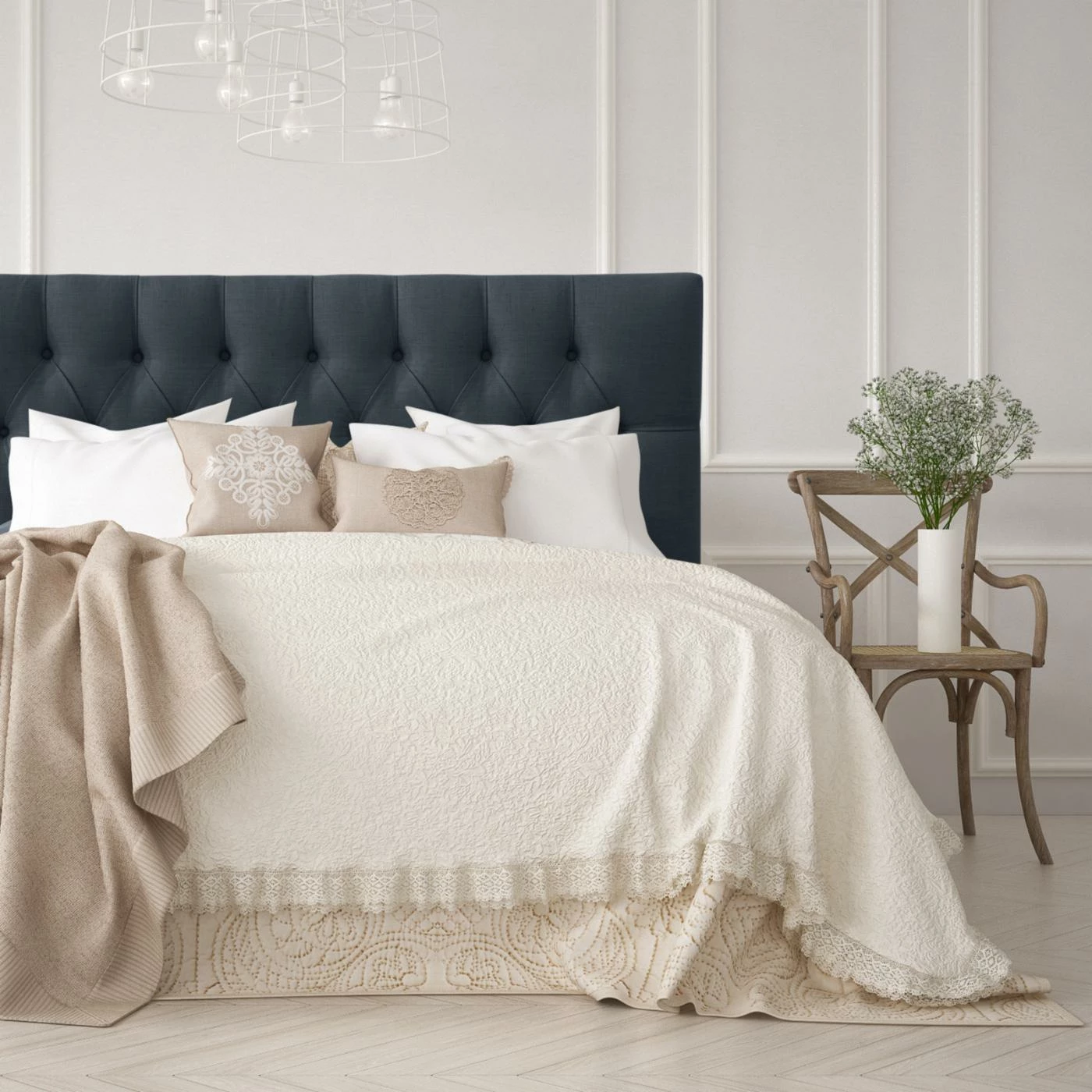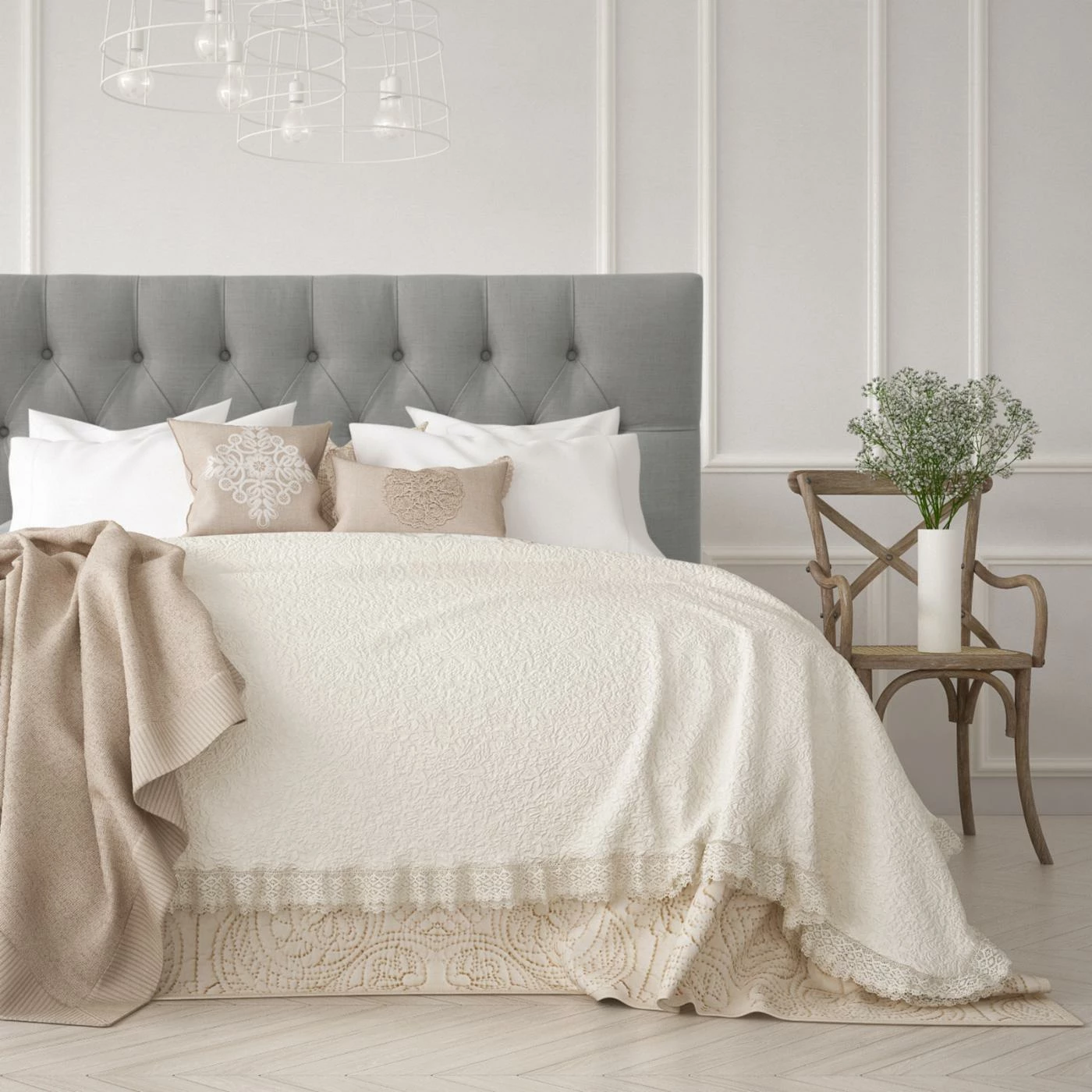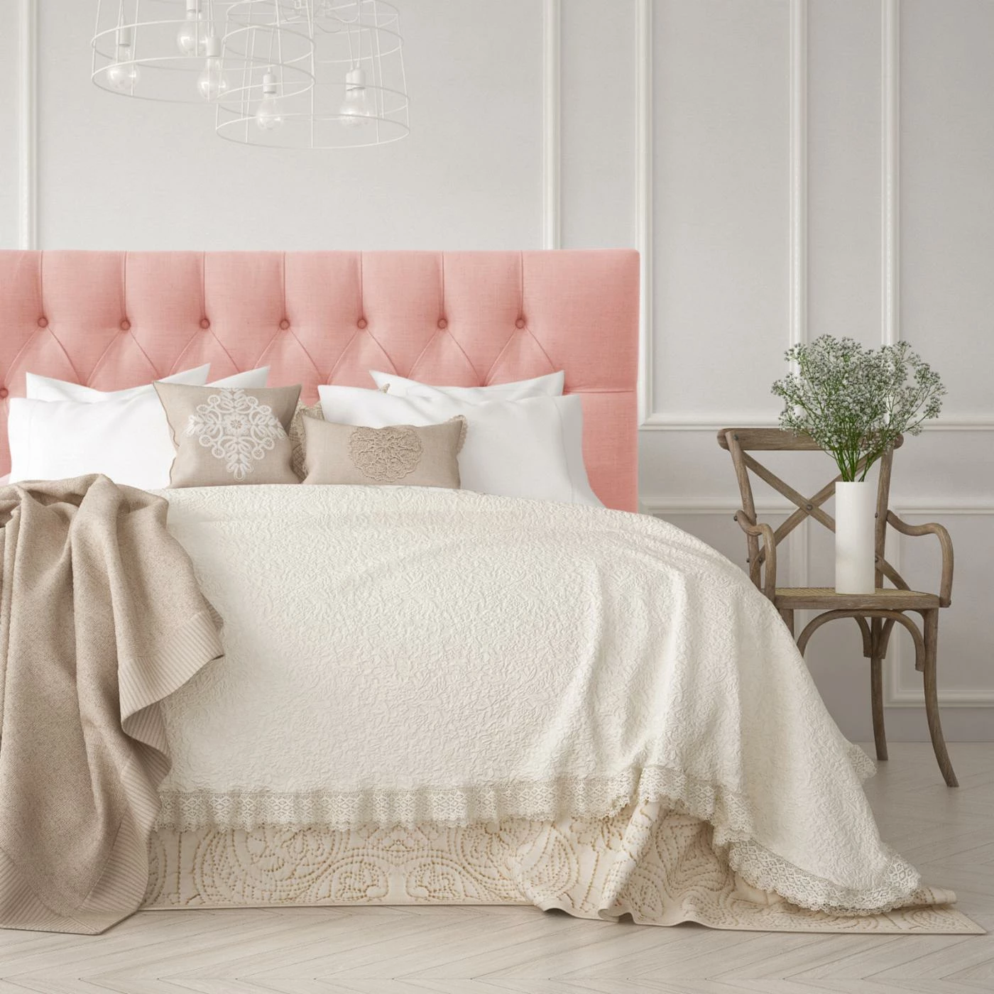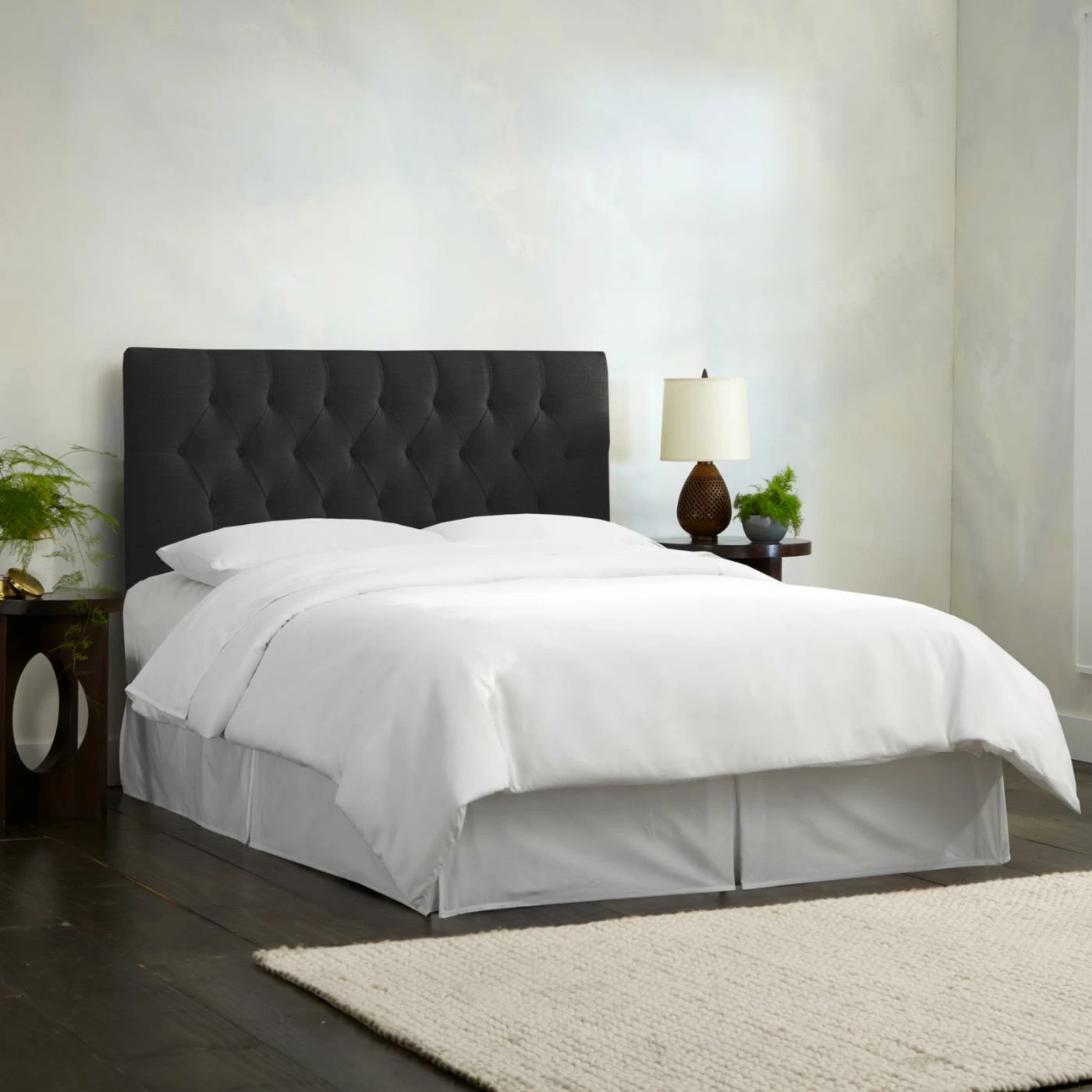 With the Skyline Tufted Linen Upholstered Headboard, you’re fated to enjoy 365 luxurious nights each year. This headboard is available in a comprehensive range of size options and works with any standard bed frame. Diamond tufting indicates a high level of craftsmanship, and in fact, this headboard is crafted with pride in the USA. The interior frame is pine, and you’ll receive metal legs and a hardware kit for securely attaching this headboard to your frame. Nail head trim along the wings provides a lustrous finishing touch!