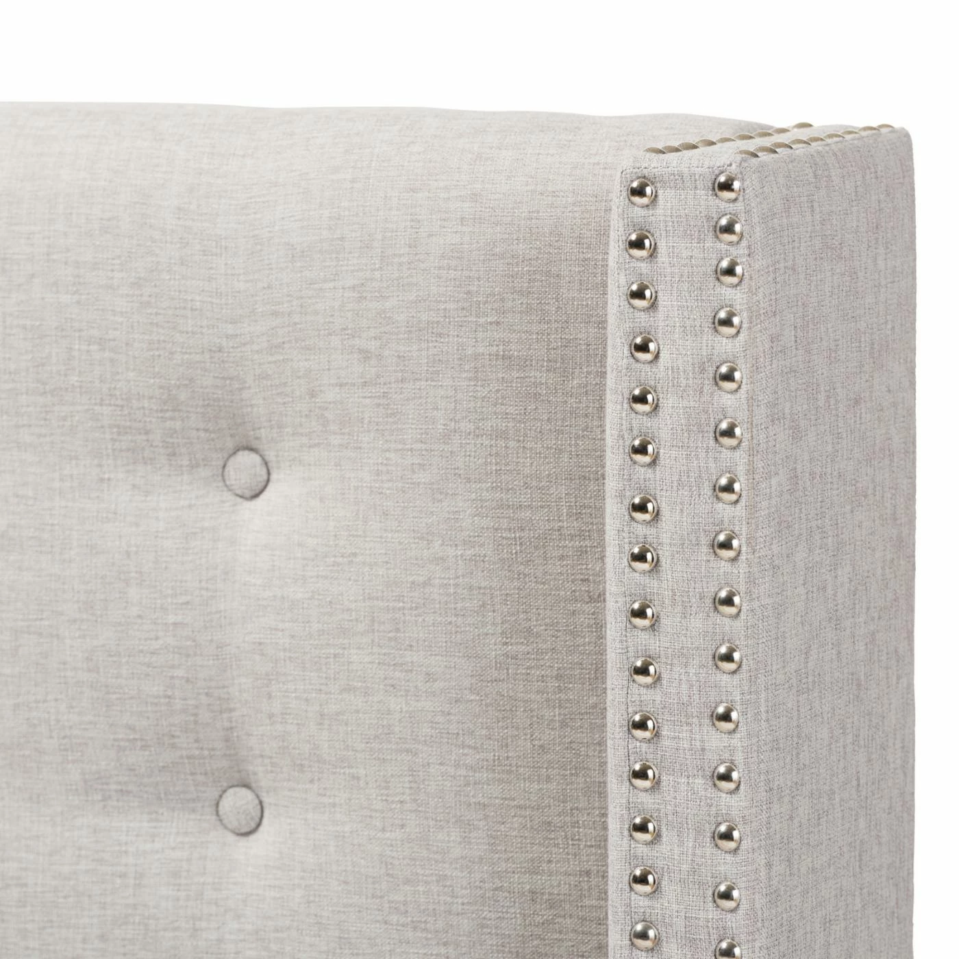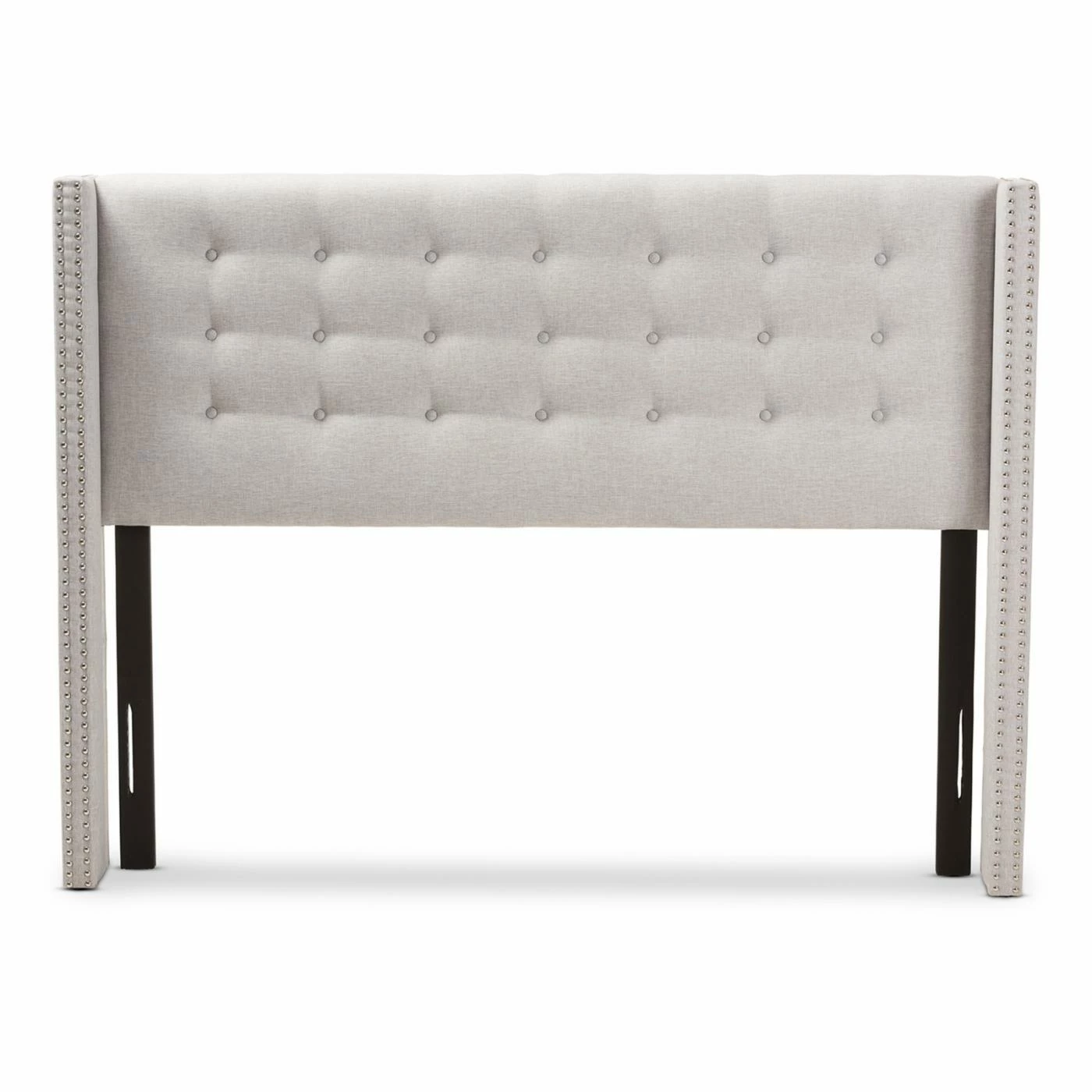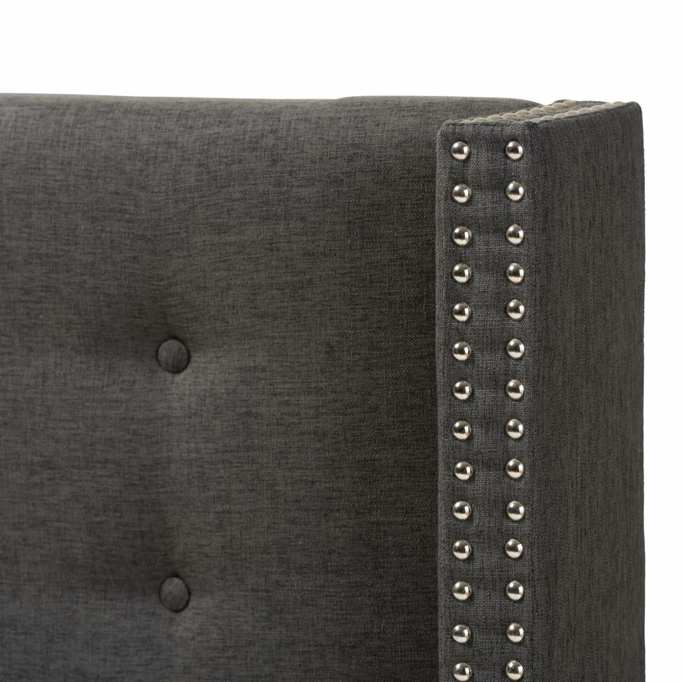Breathe some new life into your bedroom with the Baxton Studio Ginaro Fabric Button-Tufted Nailhead Winged Headboard. This handsome, contemporary-style head board is a modern twist on the classic wingback design. Its rectangular shape is flanked by two squared wings, all crafted from thick engineered wood and metal. The frame is padded with high-density foam and upholstered in fine polyester fabric. Square tufted graces the face of the headboard while the fronts of the wings are studded with silver nailheads. Choose your size and fabric color from the available.
