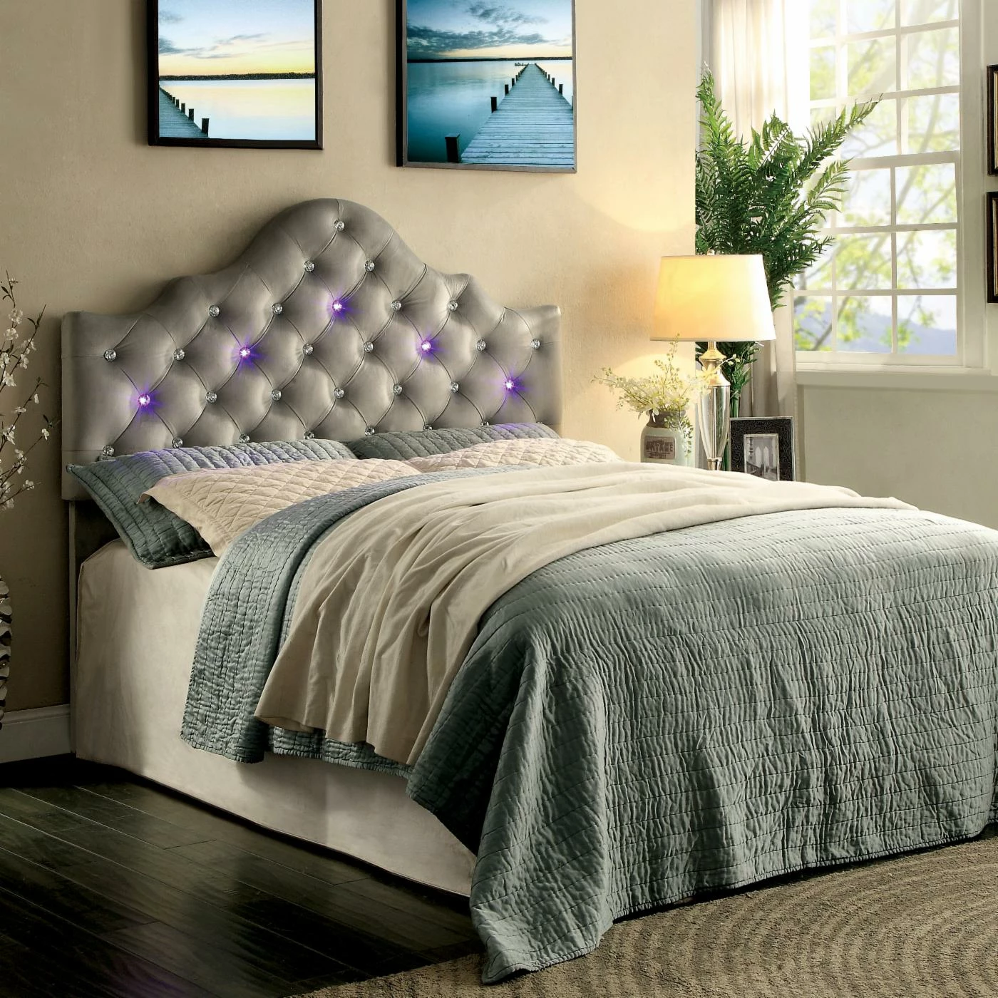 Cap off your bed frame with a dazzling new headboard in the Furniture of America Elizine Contemporary LED Tufted Camelback Fabric Headboard. This piece has a timeless camelback shape with a diamond-tufted surface. Thick wood constructs the frame, padded generously with foam. A lush fabric upholsters the piece with your choice of available color. The tufting is made from clear acrylic with built-in multi-colored LEDs, controlled by a side-mounted toggle. Choose size option from the available.