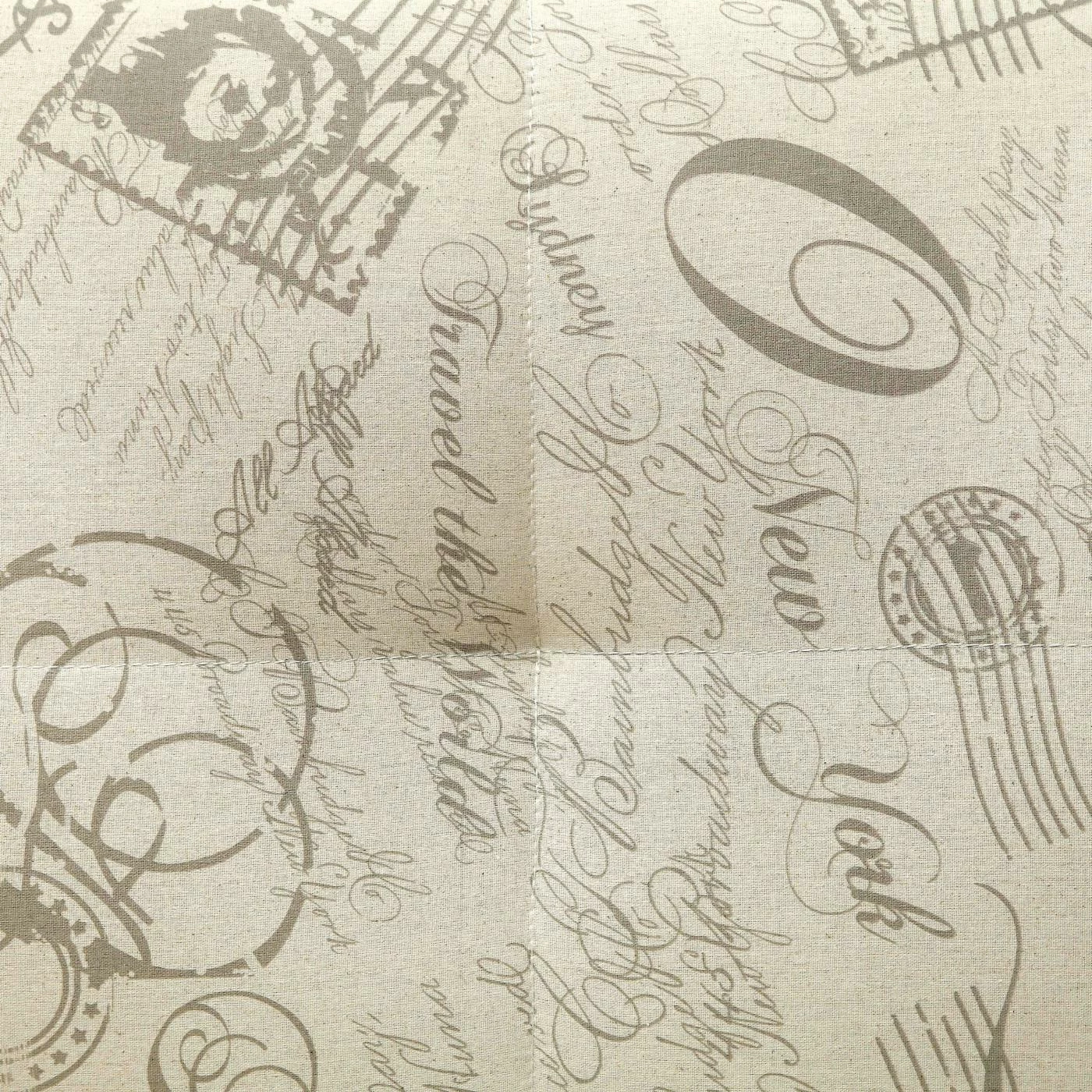 - Covered in white flannelette upholstery with script design
