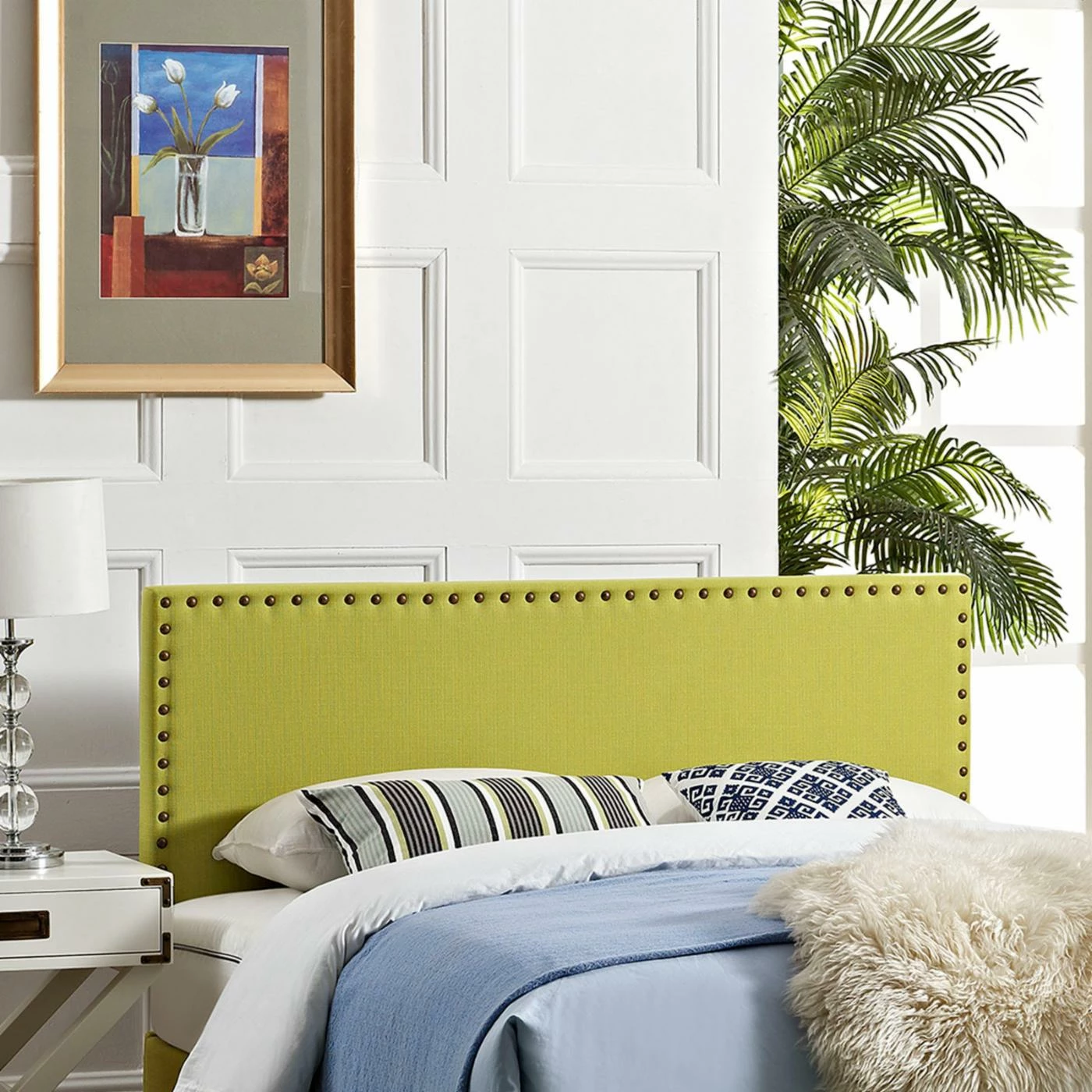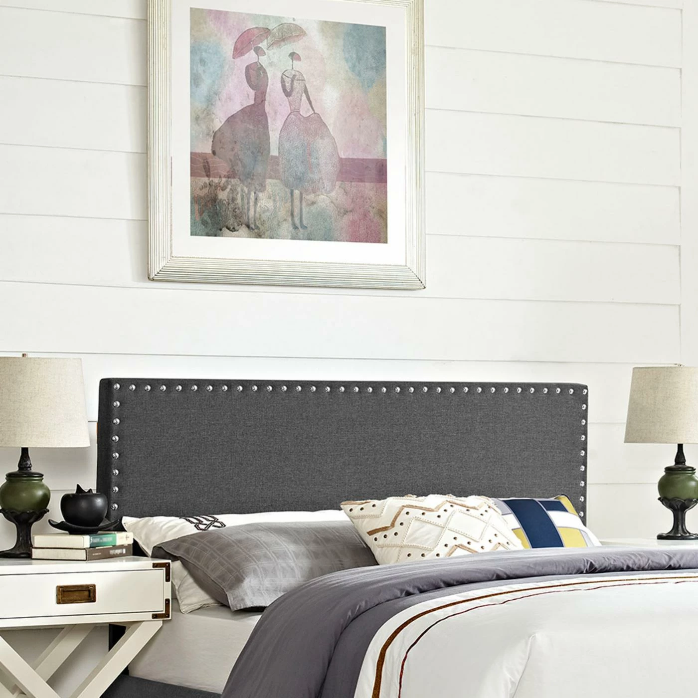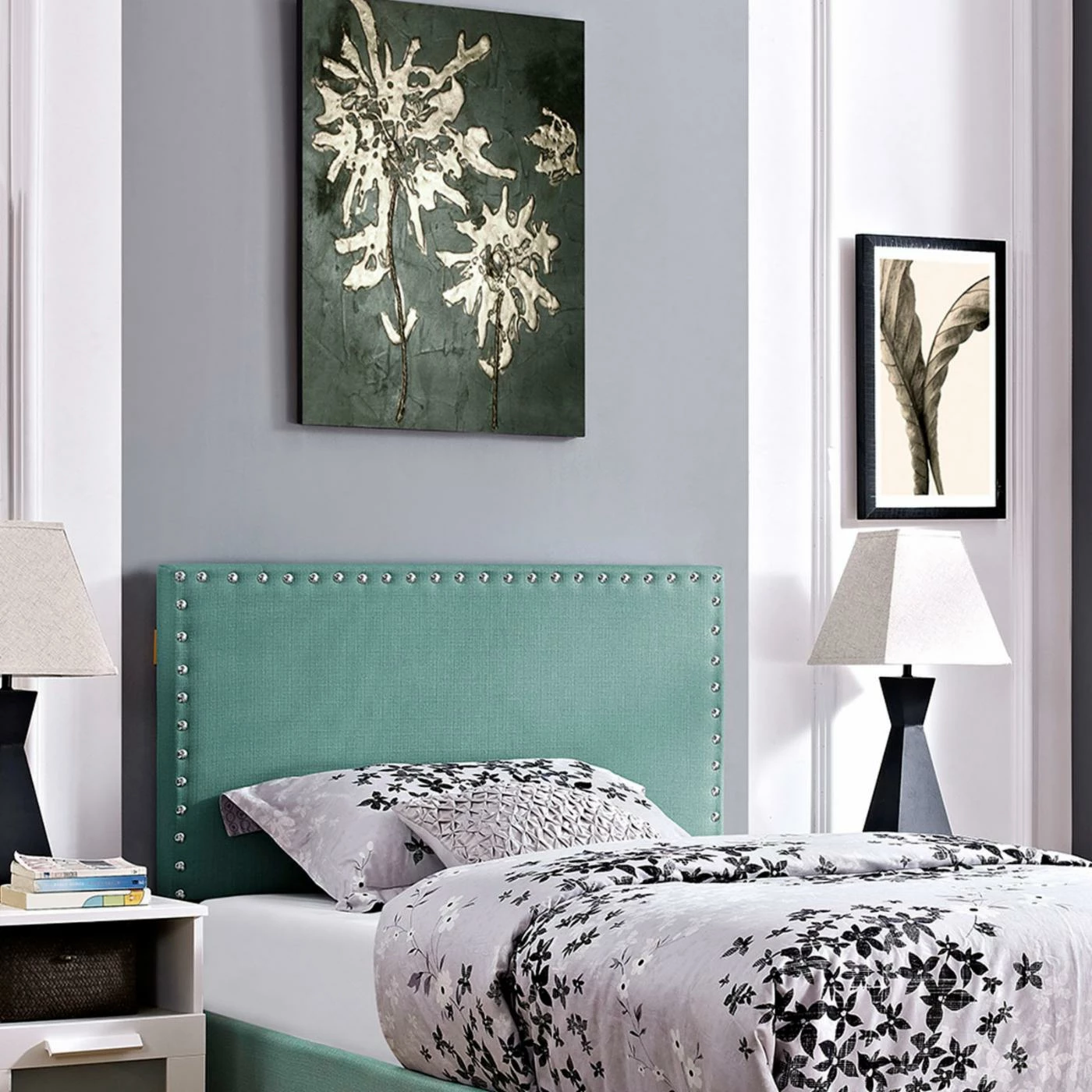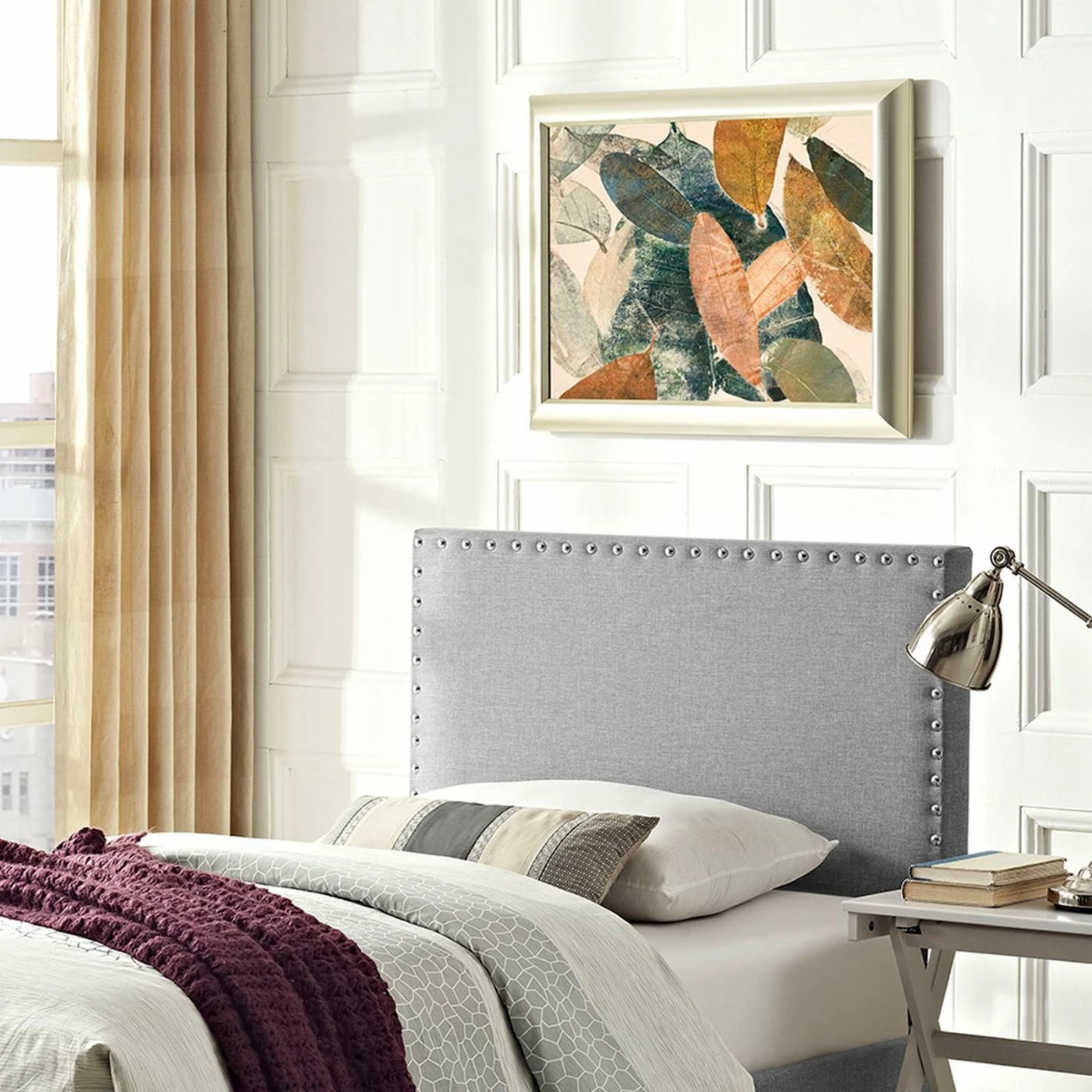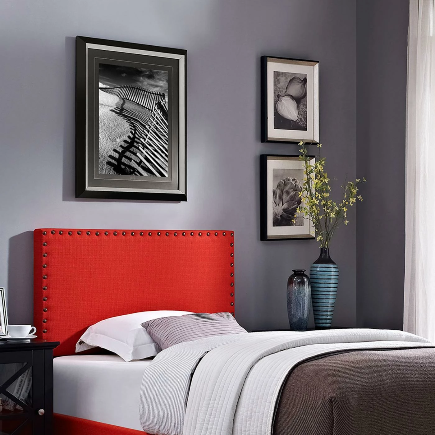 Minimalist yet chic, the Modway Phoebe Upholstered Headboard will add a note of glamour to your home. Designed with a sturdy wood frame, this headboard features a faux leather trim enhanced by nailhead trim. Its sleek upholstery is sure to complement multiple decorative schemes, while the clean lines elevate your bedroom style with a modern aesthetic. Adjustable metal legs are a convenient bed attachment.