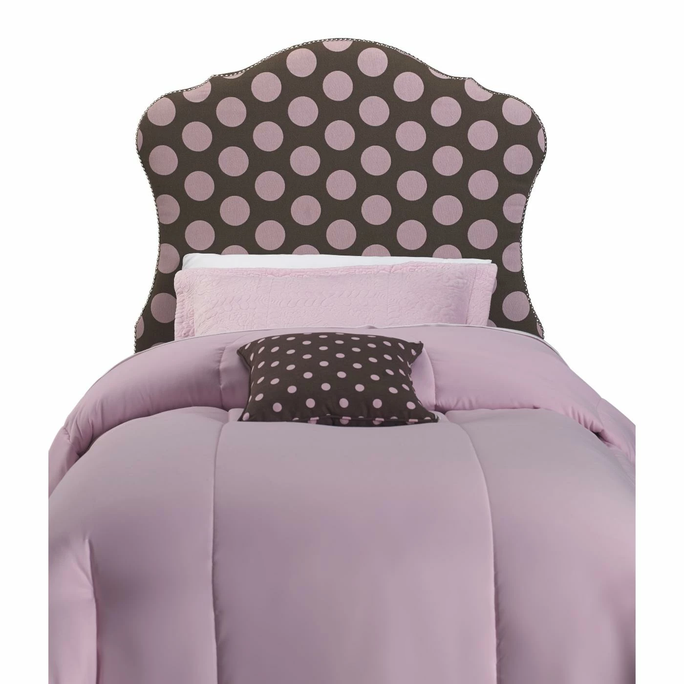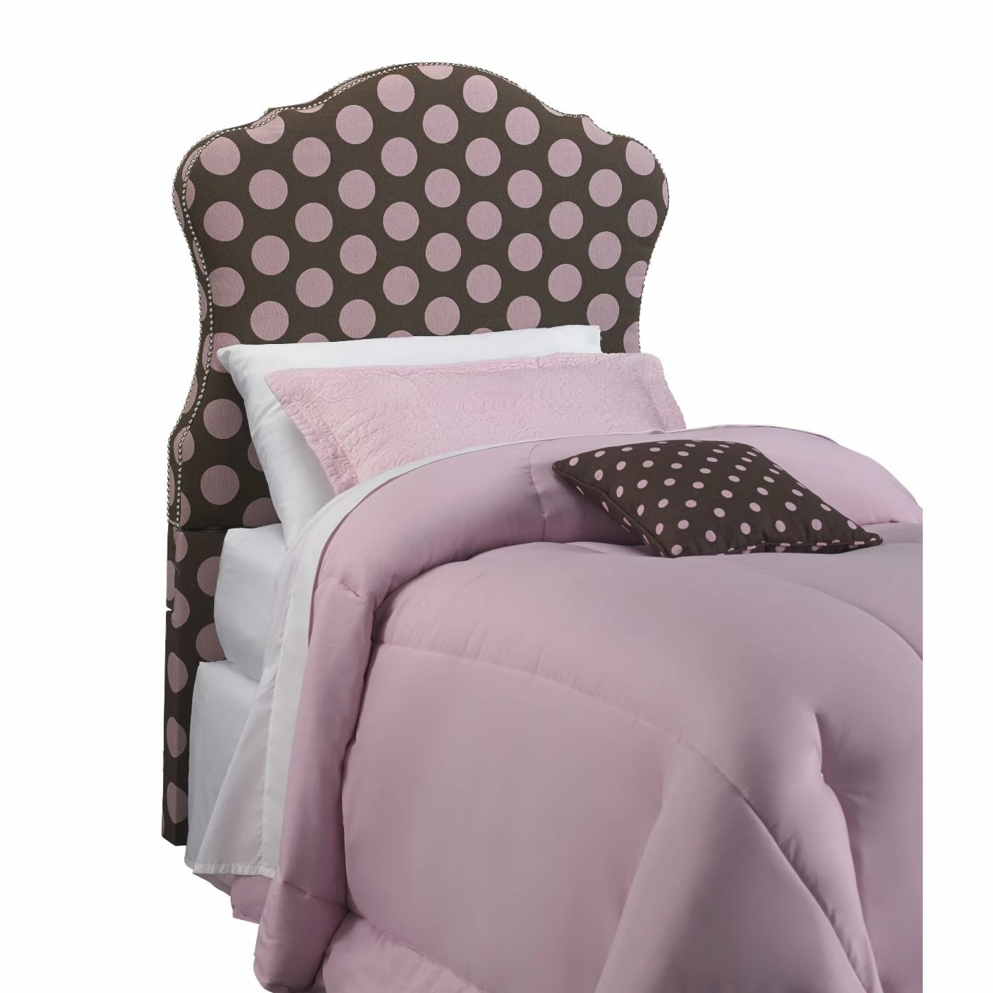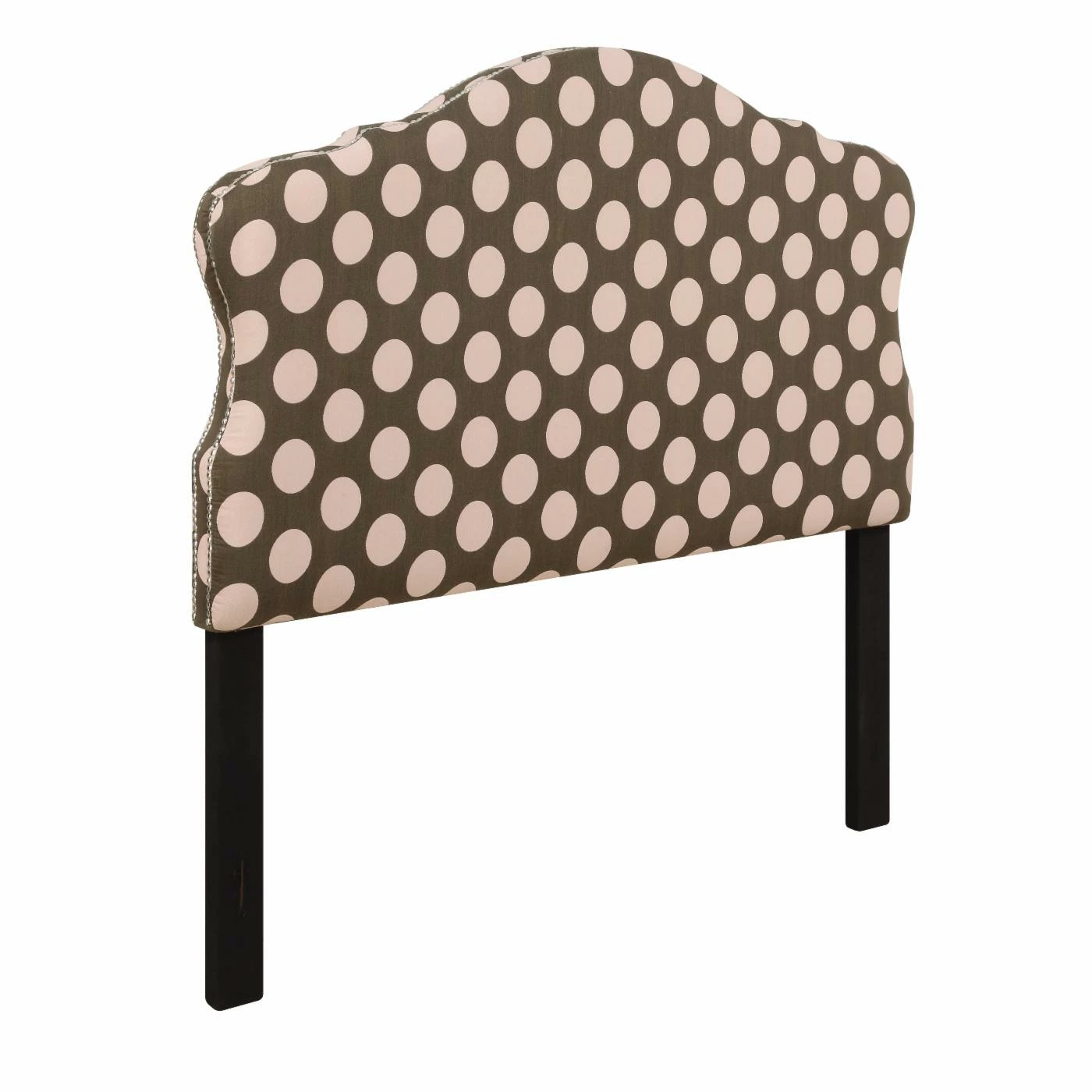 Charming curves add whimsical style to the Right2Home Dana Upholstered Headboard. Oversized pink polka dots on chocolate brown fabric upholstery and a nail head trim lend this headboard a delightful vibe for any bedroom. Plush padding brings it a soft, comfy finishing touch.