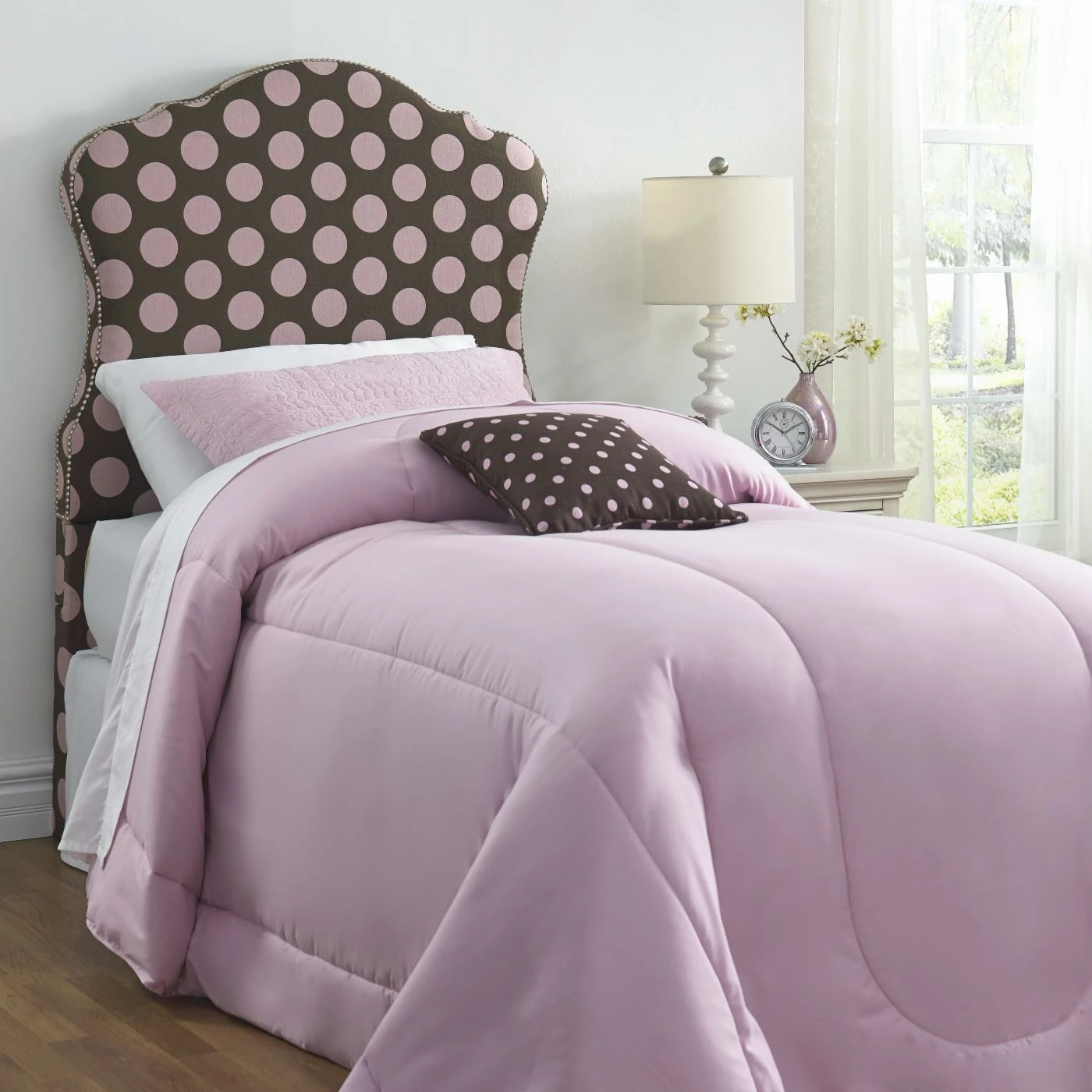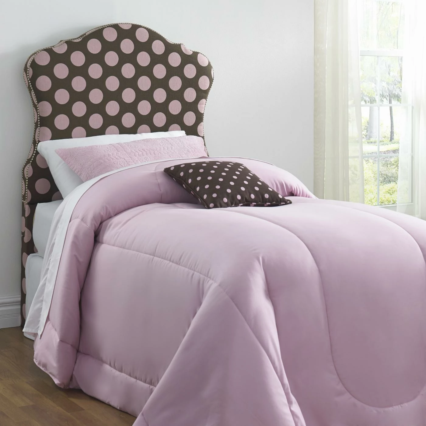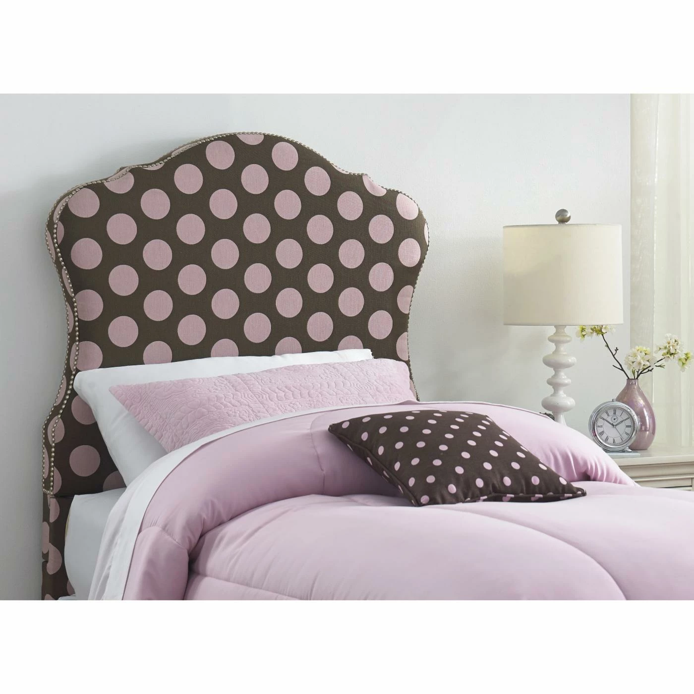 Charming curves add whimsical style to the Right2Home Dana Upholstered Headboard. Oversized pink polka dots on chocolate brown fabric upholstery and a nail head trim lend this headboard a delightful vibe for any bedroom. Plush padding brings it a soft, comfy finishing touch.