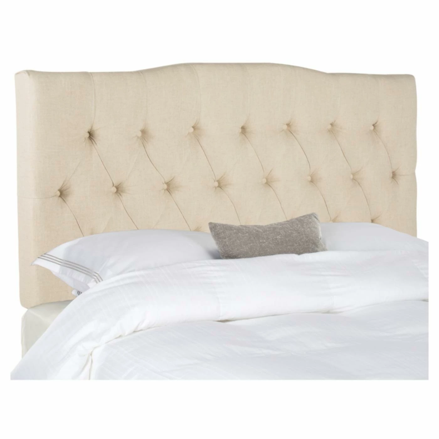 Make your bedroom feel like a quaint and cozy getaway with the Safavieh Axel Upholstered Tufted Headboard. This wide headboard has a traditional-style pastoral feel to it, featuring a rectangular shape with a subtle curved peak and a diamond-tufted face. The frame of the piece is made from tough plywood and comes upholstered in a beautiful linen-blend fabric with a thick layer of padding beneath. Choose from available size and color options.