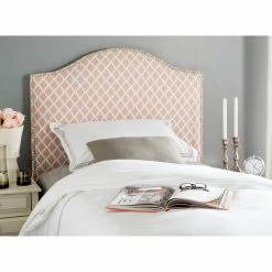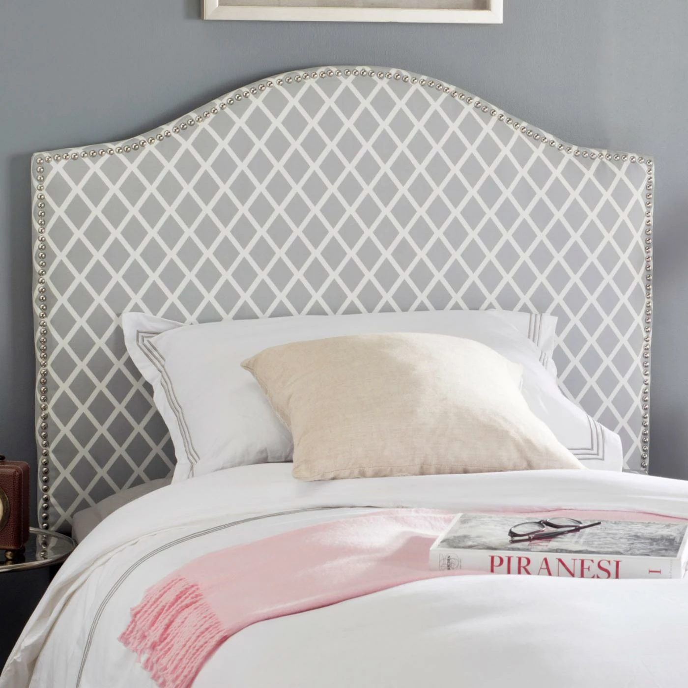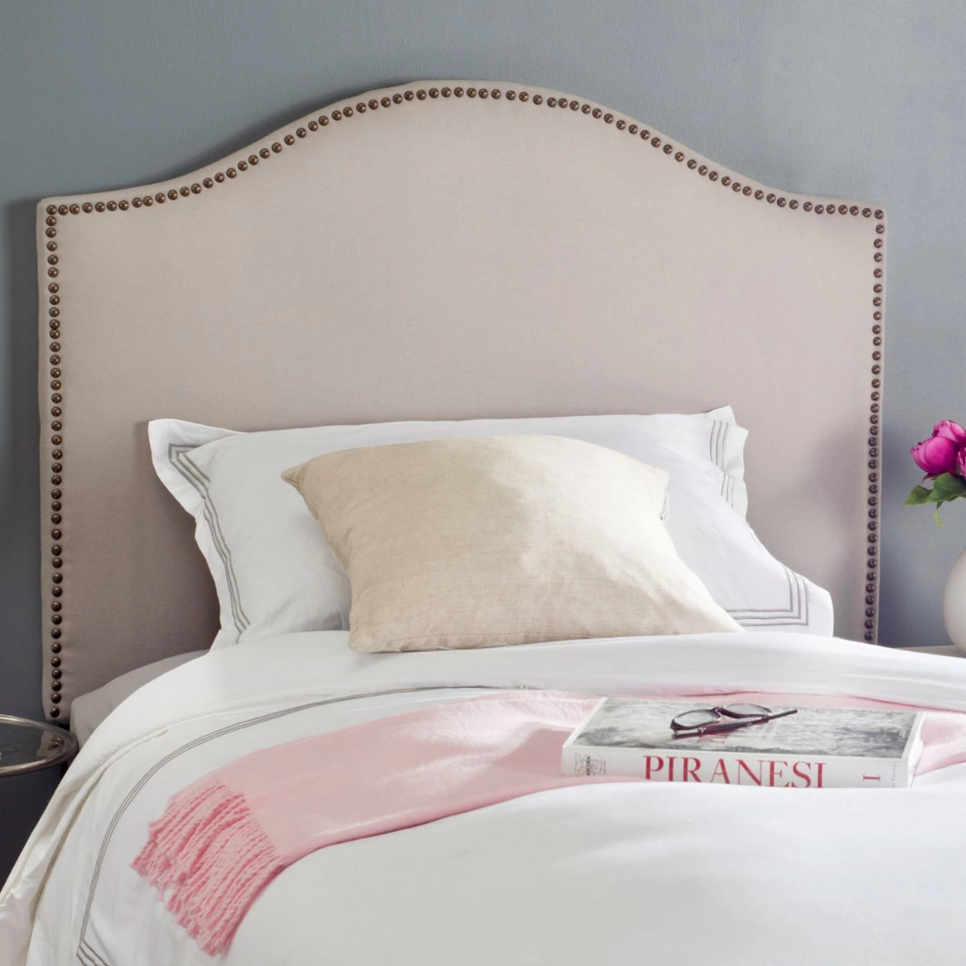 Classic, gentle curves give the Safavieh Connie Upholstered Headboard timeless appeal, while the nailhead trim gives it edge and perfectly outlines the camelback silhouette. With select size and color options, you’re sure to find the perfect addition to your bed. This headboard features thickly padded polyester and linen upholstery for added comfort and luxury.