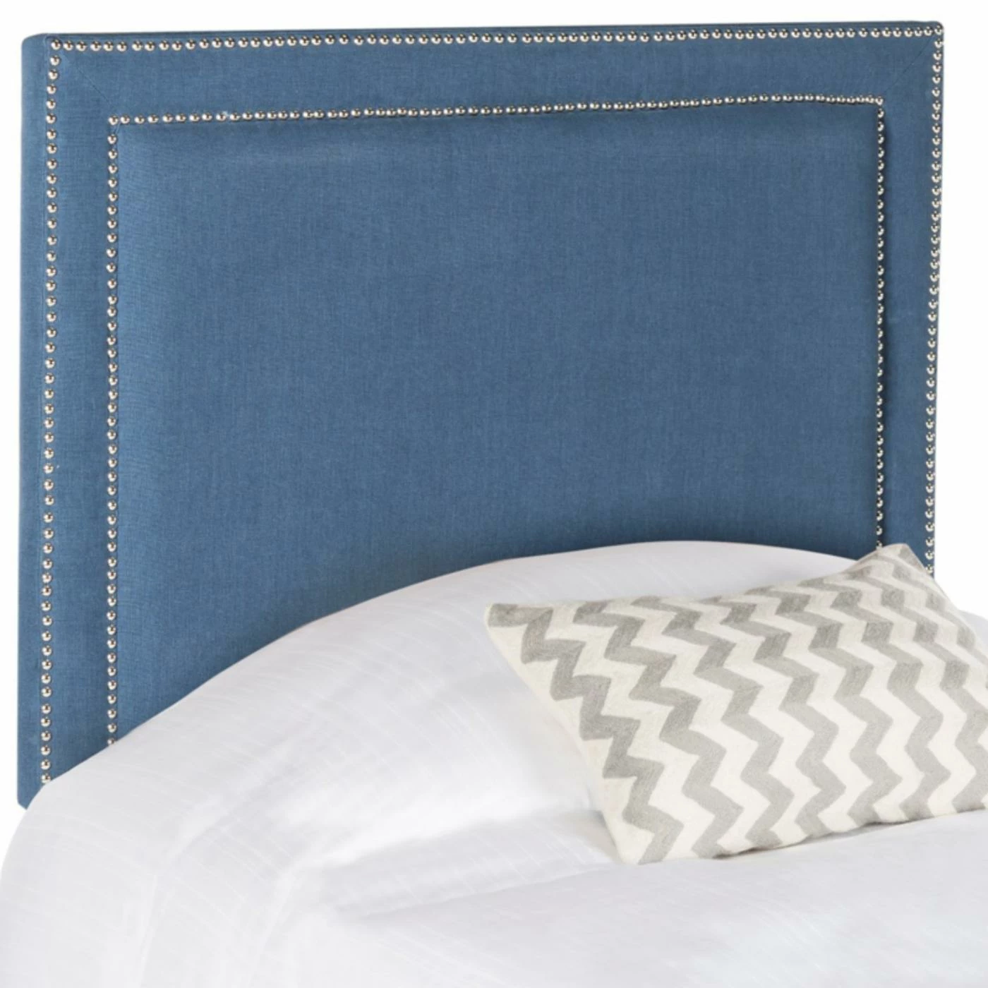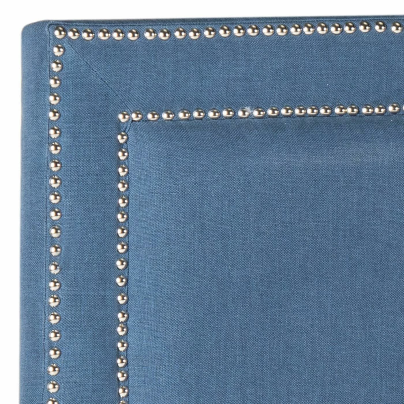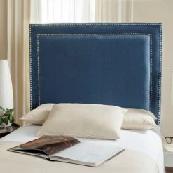The Safavieh Cory Upholstered Headboard is an ideal accent for kids with a sense of style. This headboard is designed to fit most standard twin-sized bed frames and suits modern and transitional room designs smashingly. The rectangular frame is built from fine, sturdy plywood and comes padded thickly with foam for comfort. A blend of linen, viscose, and polyester is used to upholster the piece in a rich, deep navy blue color. The edge of the headboard boasts two layers of tiny stainless steel nailheads, finished in silver.