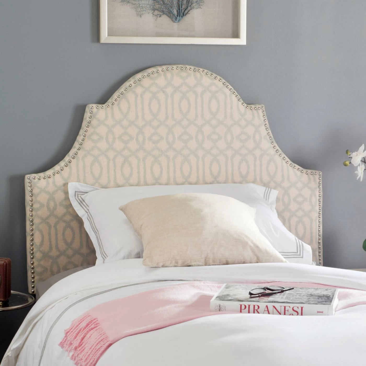 Don’t be afraid to play with colors and prints! Subtly and stylishly enhance your bed and bedroom space with the Safavieh Hallmar Upholstered Headboard. Featuring gentle curves, this stunning headboard has plush linen and polyester upholstery in your choice of available color and pattern. An optional edgy nailhead trim lines the headboard and shows off the unique arched design. Choose an available size to best suit your bed.