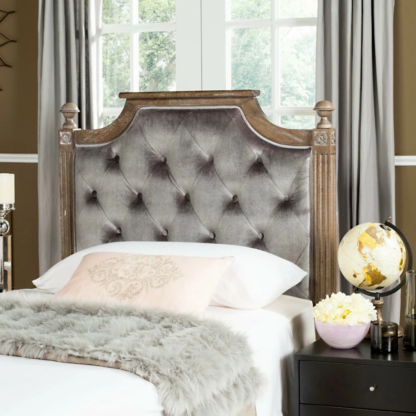 A designer favorite, this Safavieh Rustic Tufted Upholstered Headboard was inspired by the fine antiques found in Zurich’s boutique hotels. This regally appointed headboard is upholstered with your choice of tufted material and color. The notched headboard frame is crafted of wood and graced with a rustic oak finish. Details include squared and fluted columns, carved flowers, and ball finials. This headboard is available in size options.