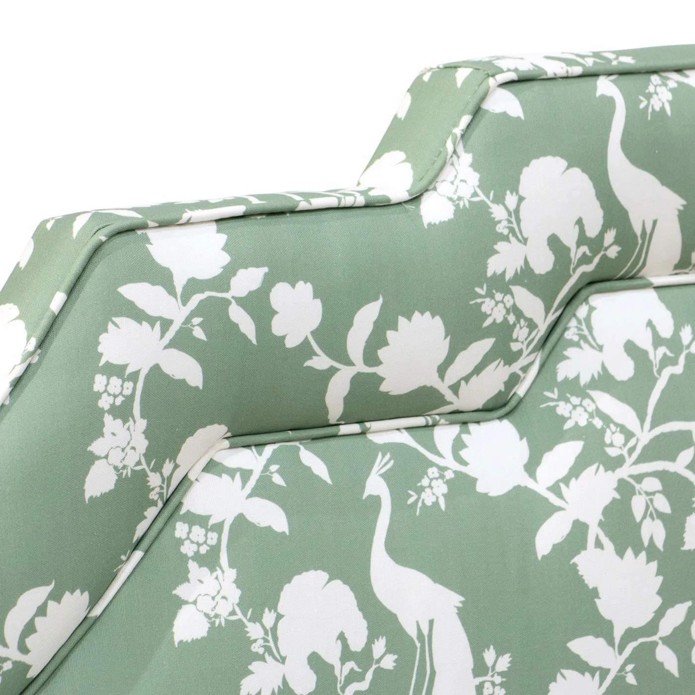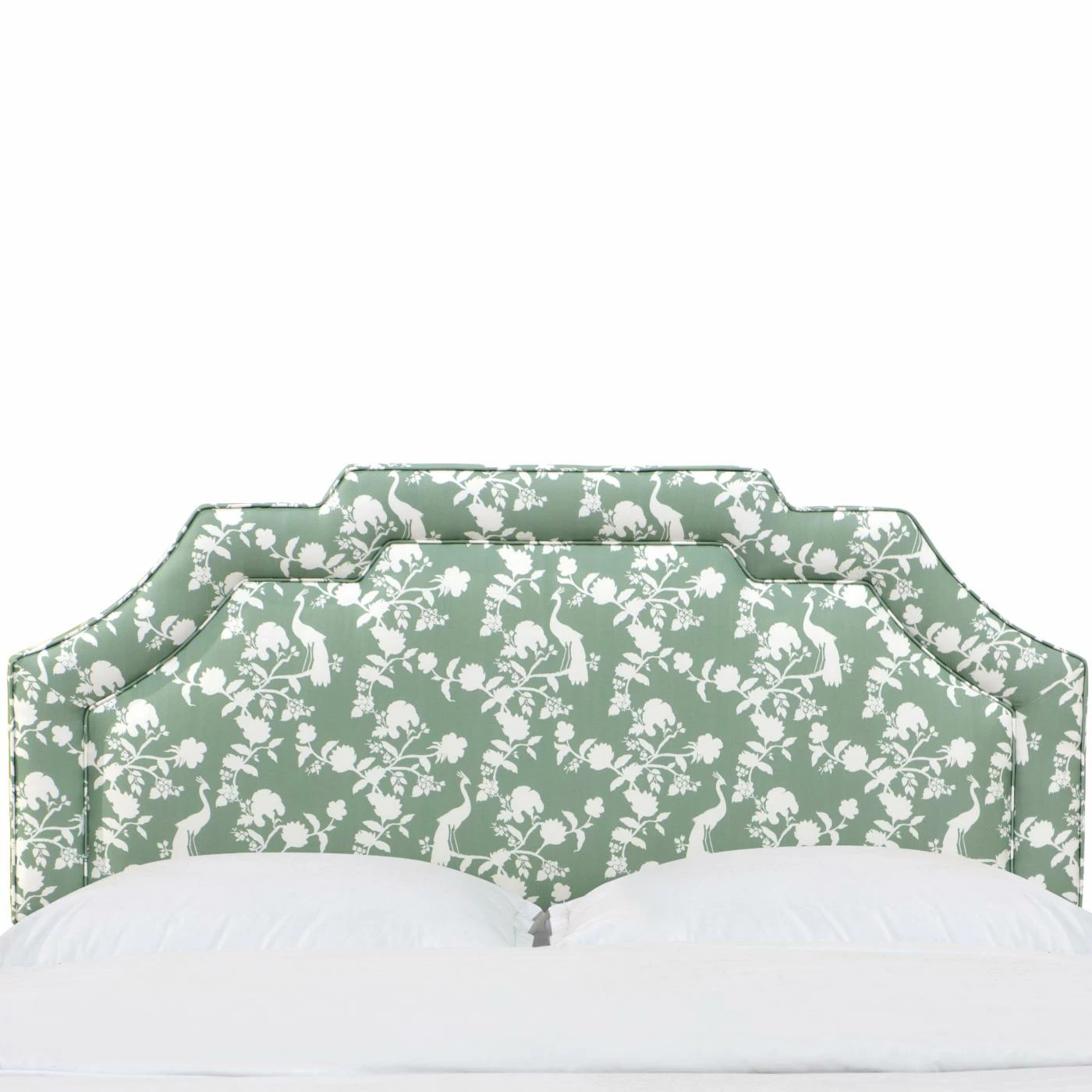 A scalloped shape with piped borders give the Skyline Furniture Peacock Silhouette Notched Upholstered Headboard a tailored look. This headboard is constructed of solid pine wood and padded with polyester foam. The 100% cotton upholstery features a pattern of peacocks and flowers in sage green and white. Choose from the available sizes to best fit your bed frame. For best care, spot clean the fabric as needed.