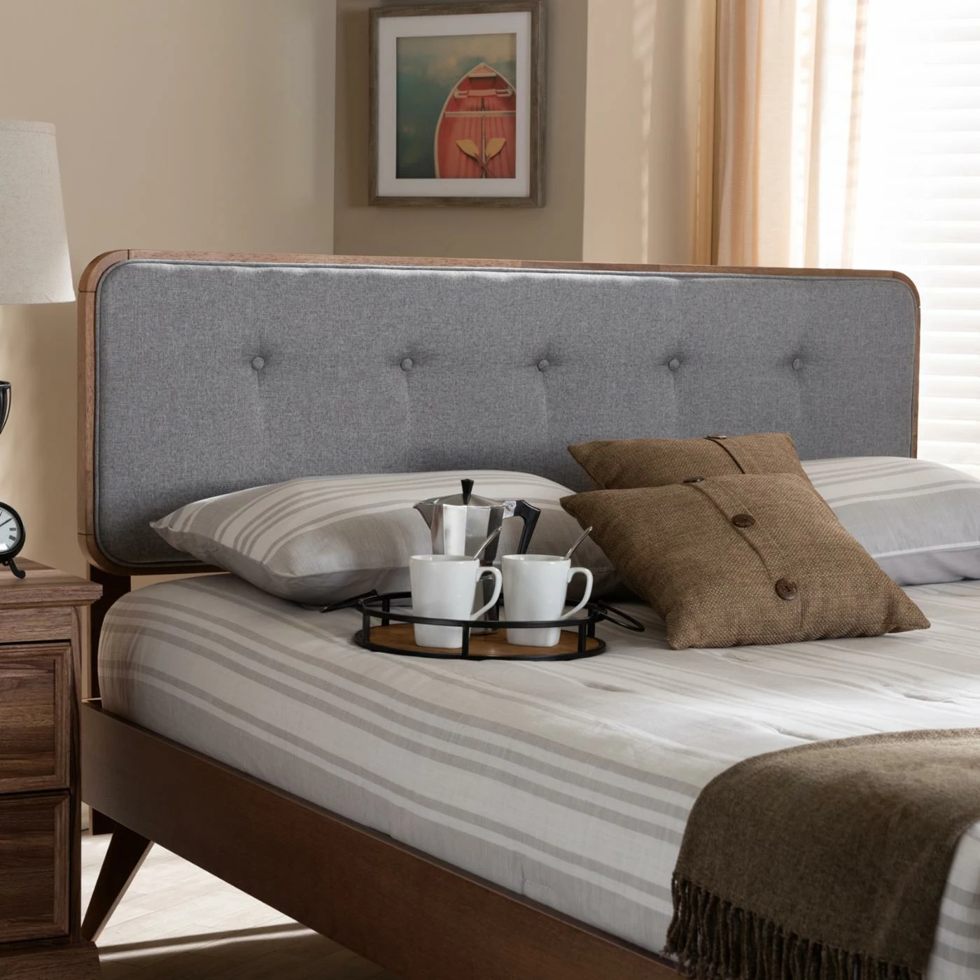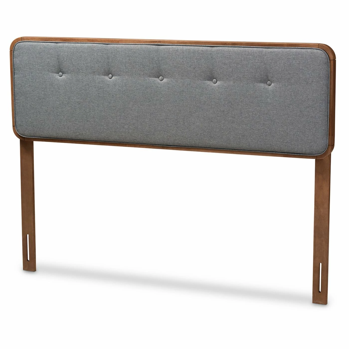 Attach the Baxton Studio Mailene Wood Headboard to an existing bed frame to give it a touch of mid-century style. This headboard features a wavy wood grain pattern in a warm ash walnut finish. The rectangular shape is accented with rounded corners and upholstered with polyester fabric. A single row of button tufts give the design a tailored look. Pre-drilled holes and bracket cutouts allow you to attach this headboard in a position that best fits your mattress and bed frame.
