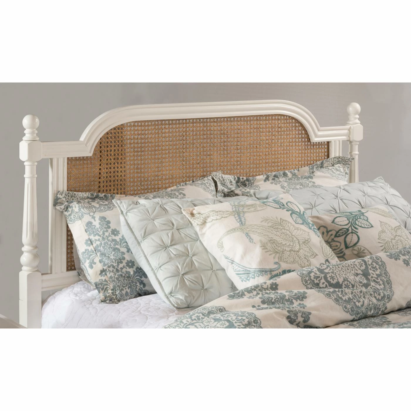Grant your guest bedroom or master bedroom a quick and easy makeover with the Hillsdale Furniture Hillsdale Melanie Queen Headboard with Optional Frame. This headboard has a country-style look with carved posts and round finial toppers. The center panel is made from woven cane with a light brown tone. Brilliant white finishes the frame. The piece is built from hardy wood. Choose among available size options. The headboard has a matching full frame (optional, as available).