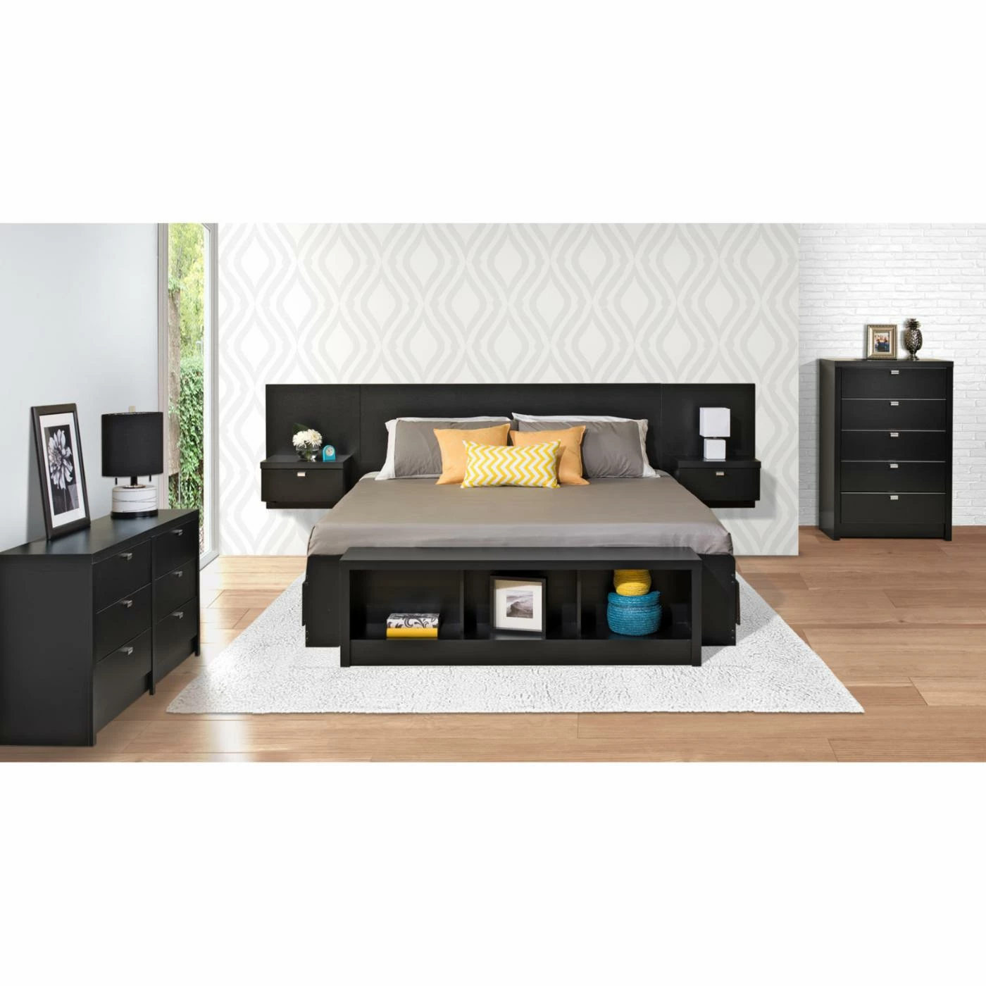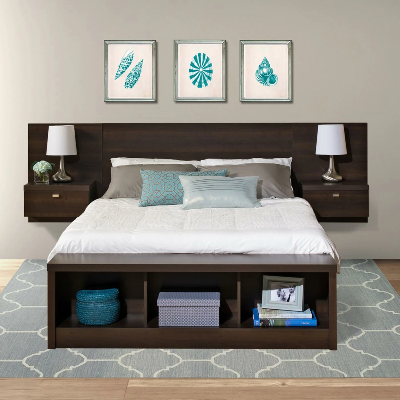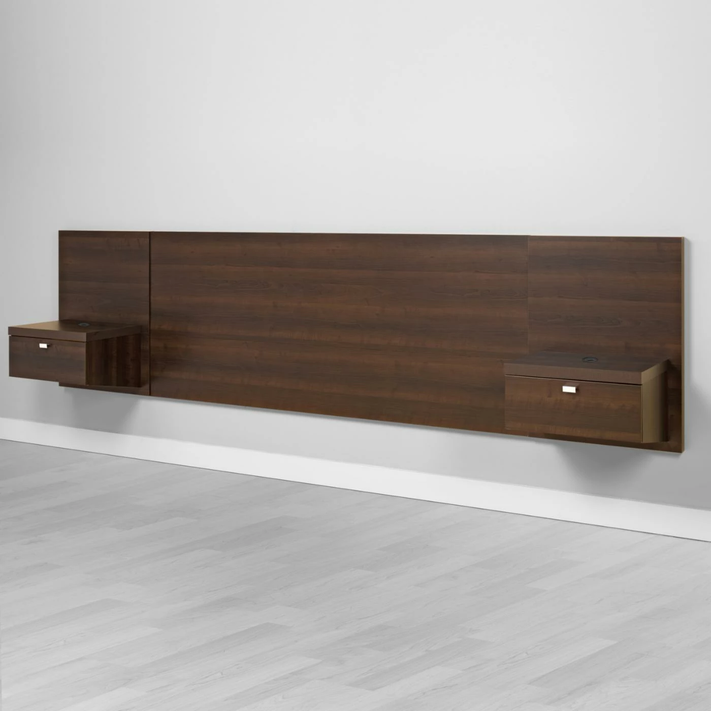 The perfect way to add functionality and fun to your bedroom, this Prepac Series 9 Designer Floating Headboard with Nightstands gives you storage and urban style. Modern lines, handsome laminate finish options, and metal pulls make the look. Each side gets a handy nightstand drawer with open shelf on top. This floating headboard with nightstands is made of solid wood and CARB-compliant, laminated composite woods for durability.