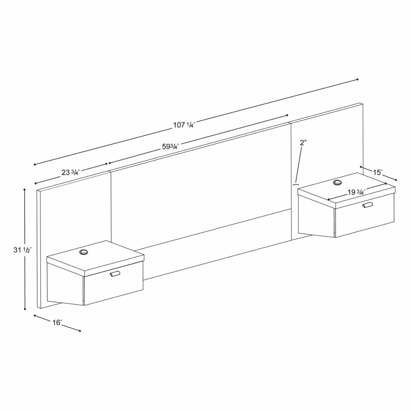 - Queen: 107.25W x 16.5D x 31.5H inches