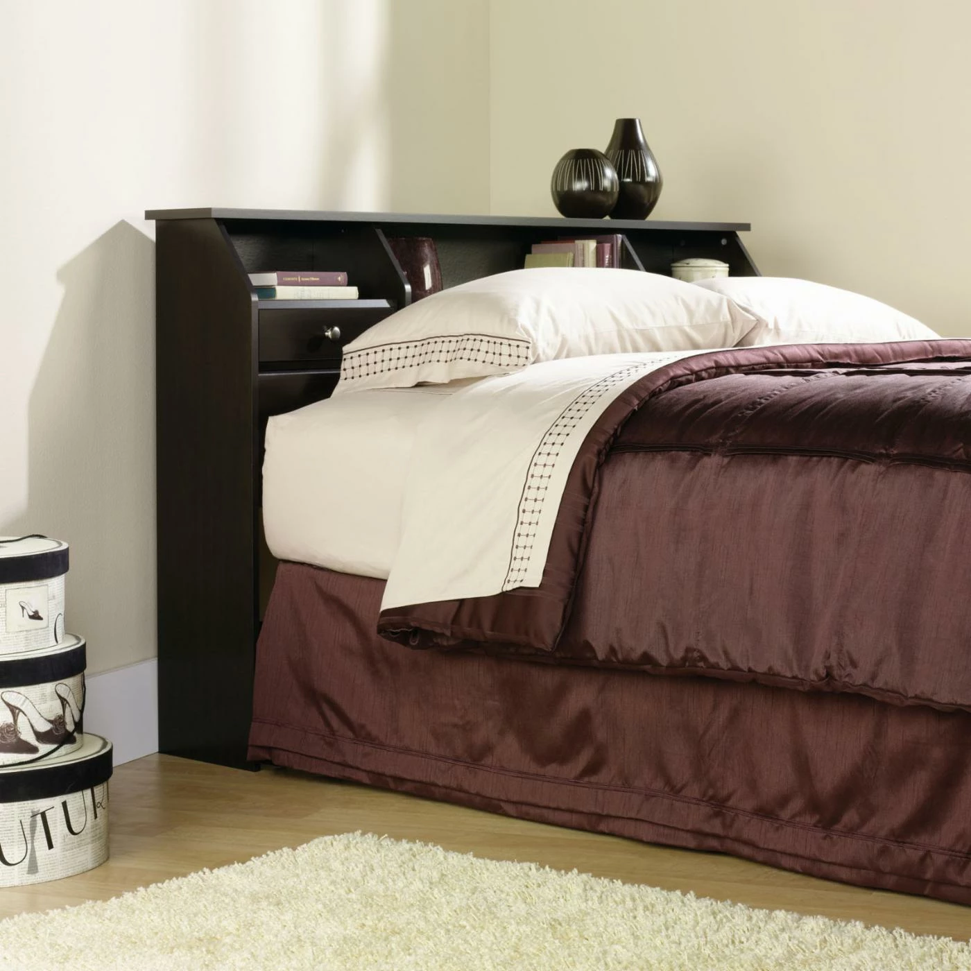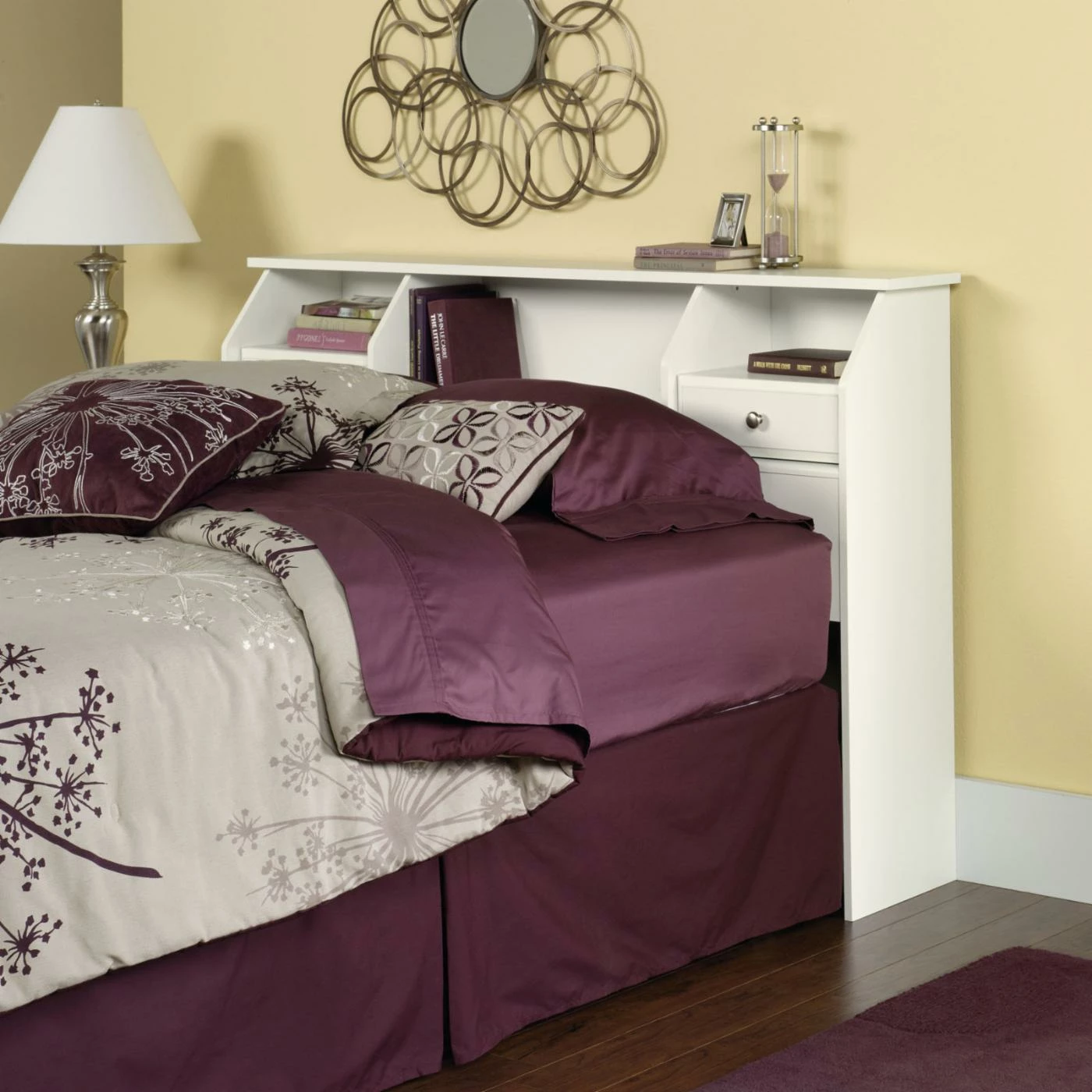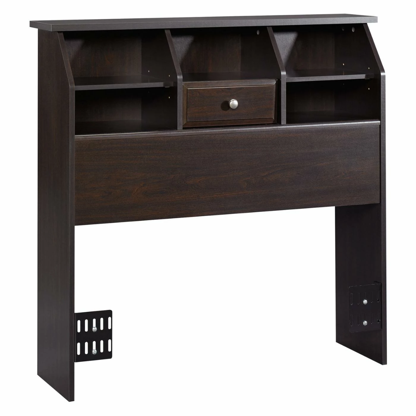 A bookcase headboard like the Sauder Shoal Creek Bookcase Headboard is a smart solution if you’re short on bedroom storage space. One large center cubby, two side cubbies, and a two small drawers create great spots to store all your bedside essentials. The headboard is crafted of engineered wood, and it’s available in a variety of finishes and sizes. It attaches easily to your bed frame (not included), and the enclosed back panel includes a cord access hole.