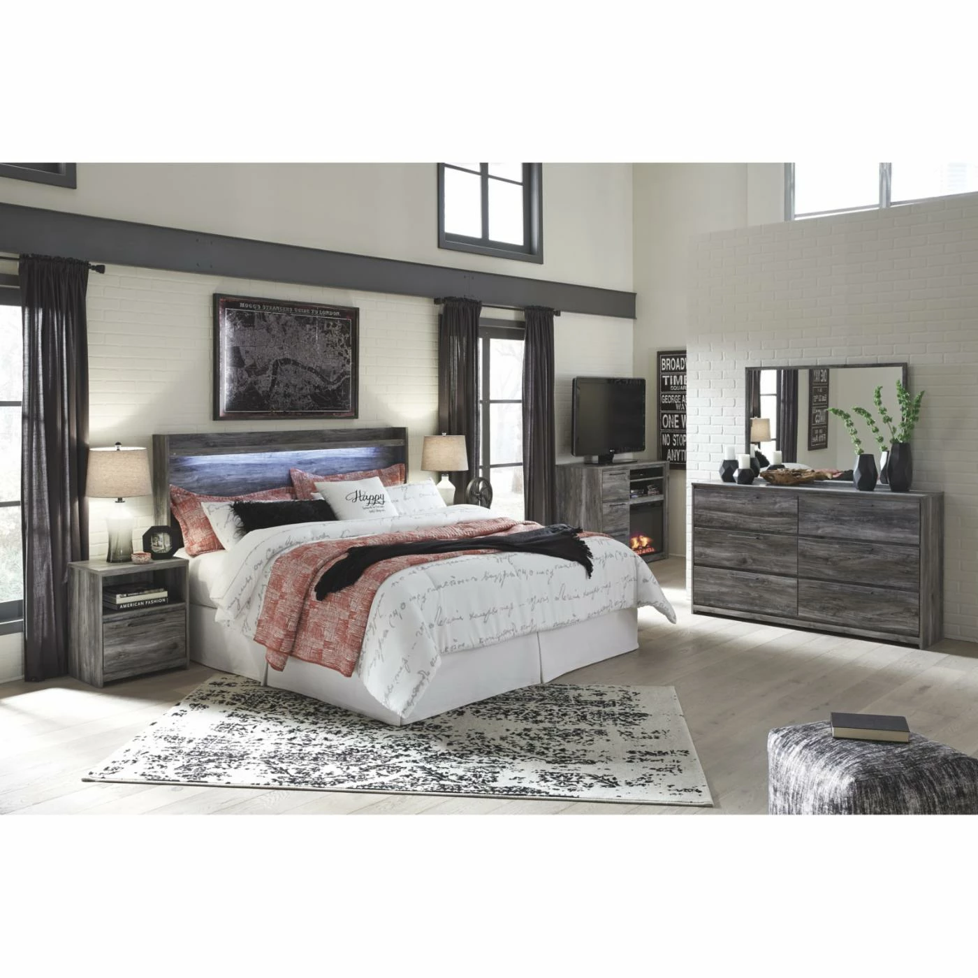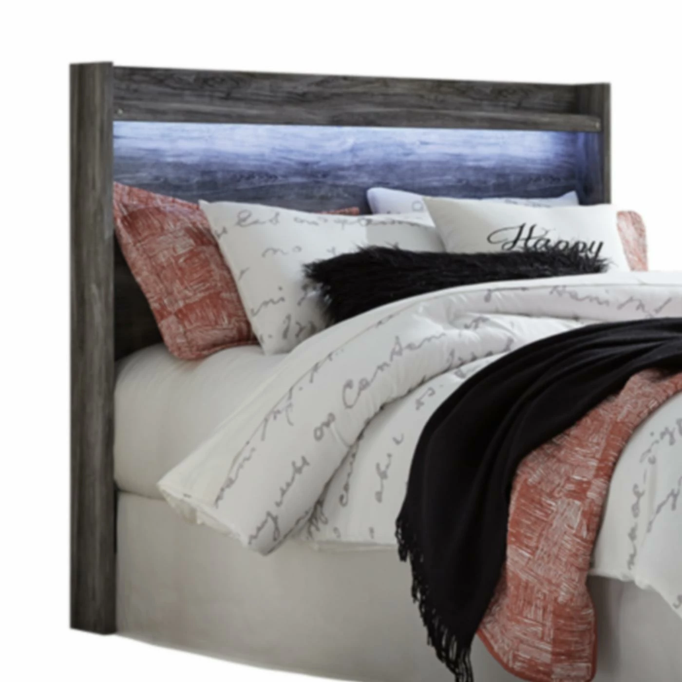 Bring the charm of the islands into your bedroom with the sleek, gray Signature Design by Ashley Baystorm Panel Headboard. It’s crafted from engineered wood that’s designed to replicate the grain of oak then topped with a smoky finish that creates a tonal appearance. Straight lines and sharp angles give this headboard a clean look, and it has protruding sides that encase the head of the mattress. This is an excellent headboard to complement coastal or tropical dΓ©cor.