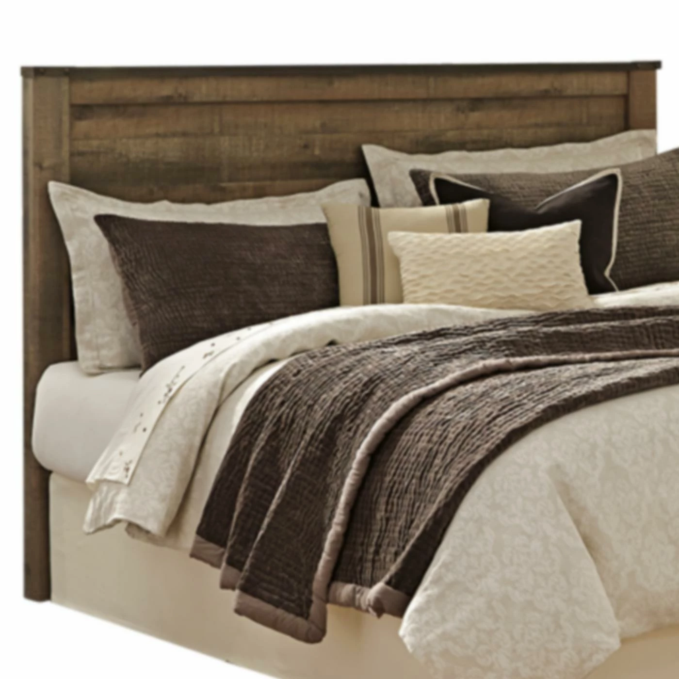 The ruggedly handsome Signature Design by Ashley Trinell Wood Panel Headboard is built of engineered wood with a rustic brown finish over a replicated oak grain. The top of its simple design is accentuated by rustic metal banding and exposed bolts in a dark bronze finish. Attach this headboard to your metal bed frame (sold separately). Choose from available sizes.