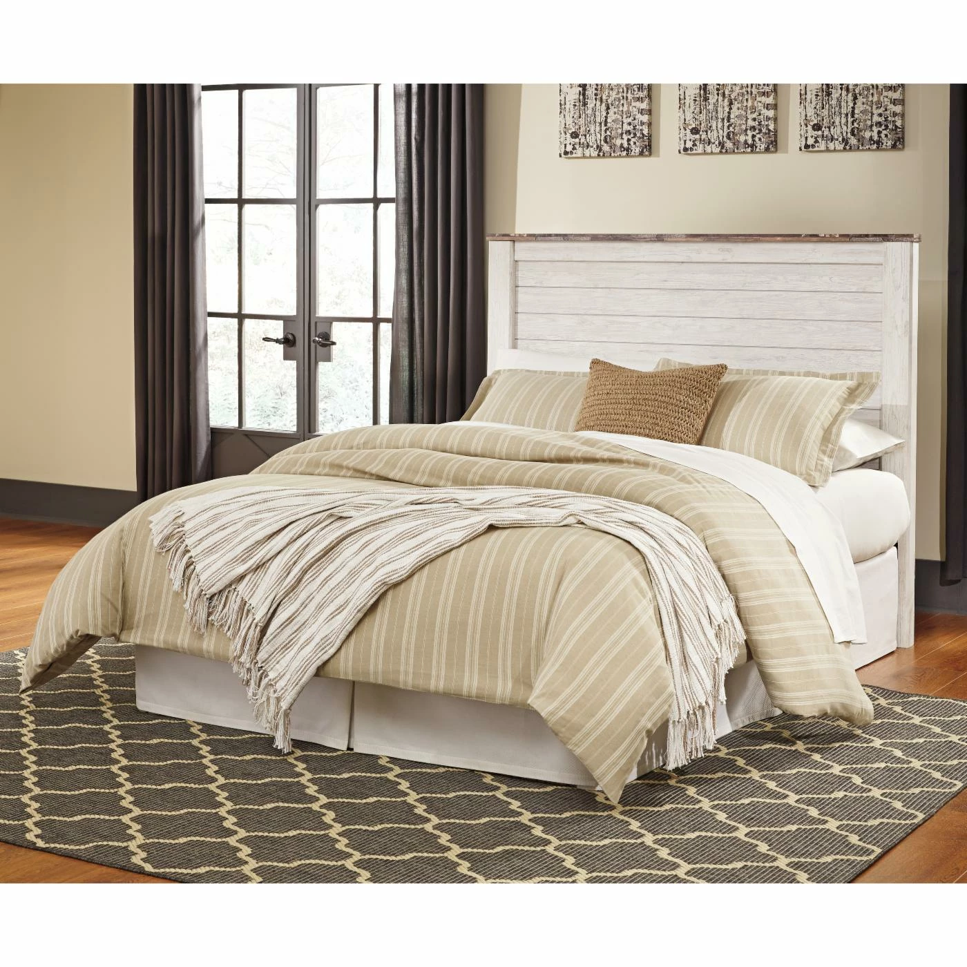 The chic, beachy Signature Design by Ashley Willowton Slat Panel Headboard brings a laid-back feeling to your bedroom. The whitewash finish beautifully highlights the replicated wood grain, while the slat design provides a casual look. Molding details complete the look. Assembly required.