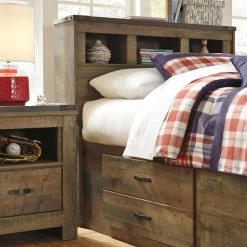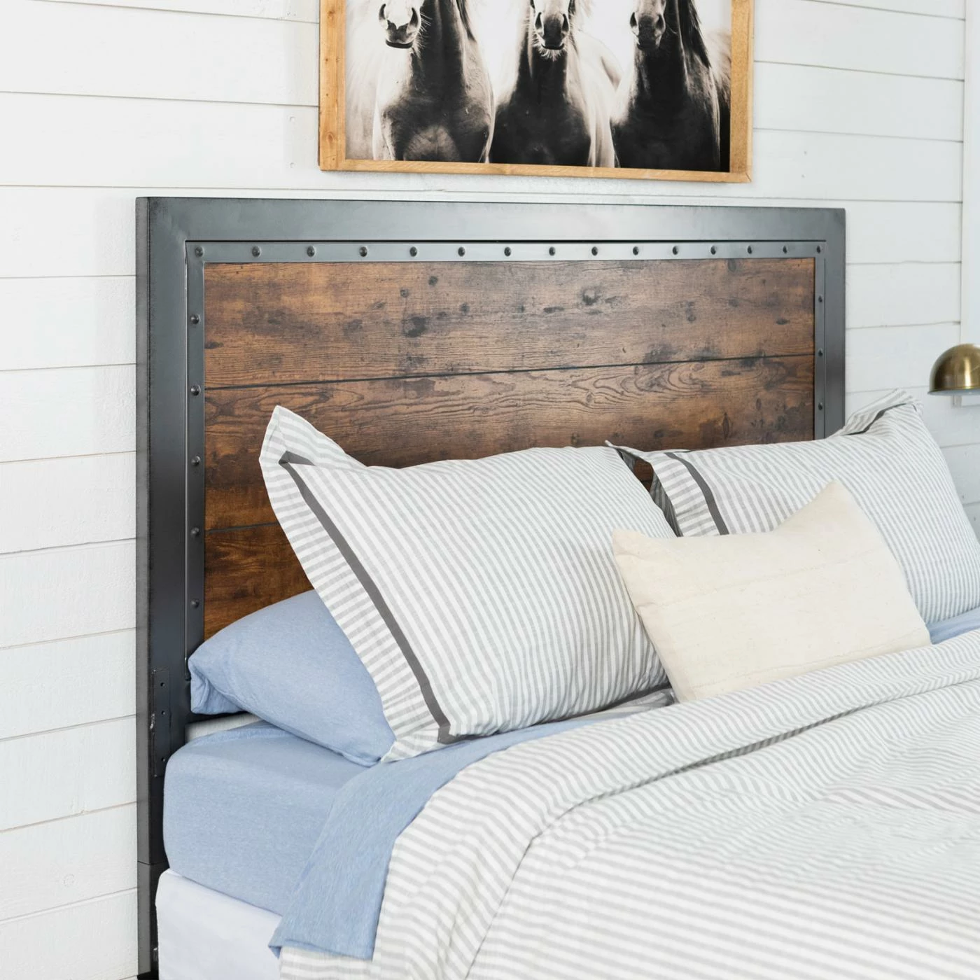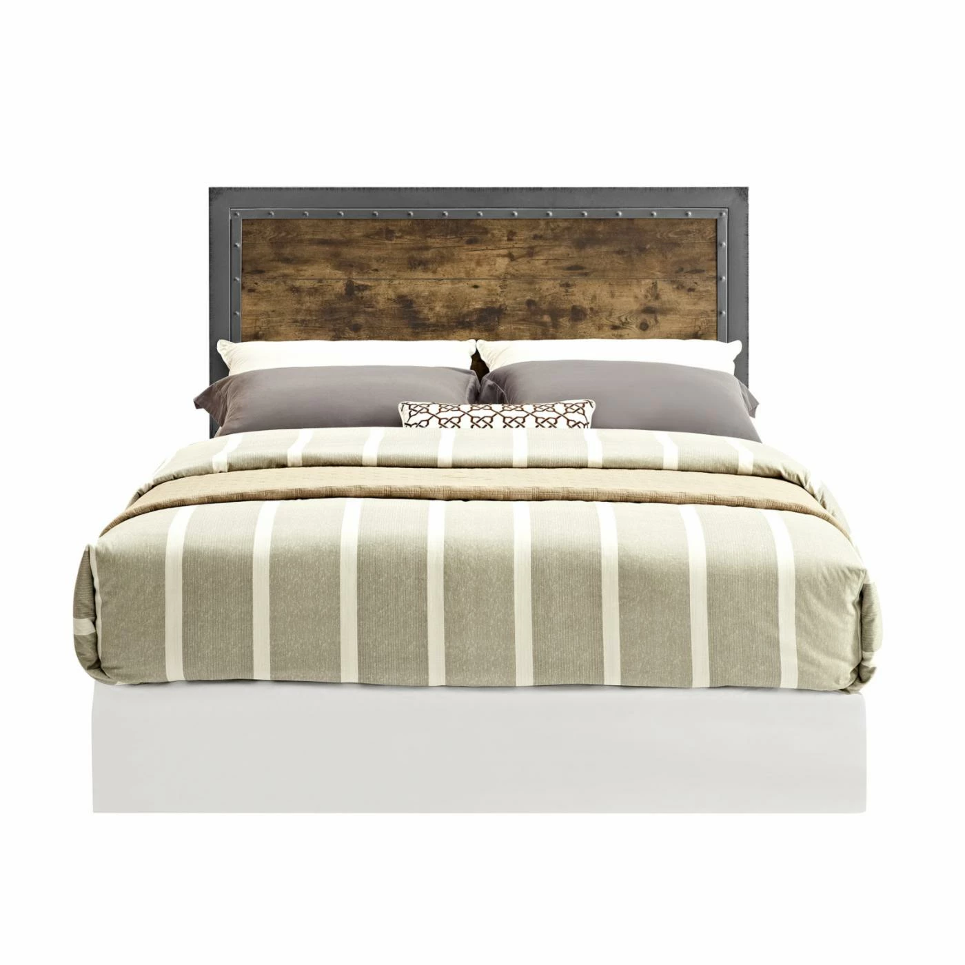 With burled wood planks and bold rivets, the HumbleNest Countryside Rustic Industrial Panel Headboard makes your design dreams come true. This queen-size panel headboard is just right for putting an up-to-the-minute industrial twist on your existing dΓ©cor. Metal elements have a powder coat finish in pewter gray. Engineered wood panels are wrapped in an extremely realistic wood grain laminate. Bed frame sold separately.